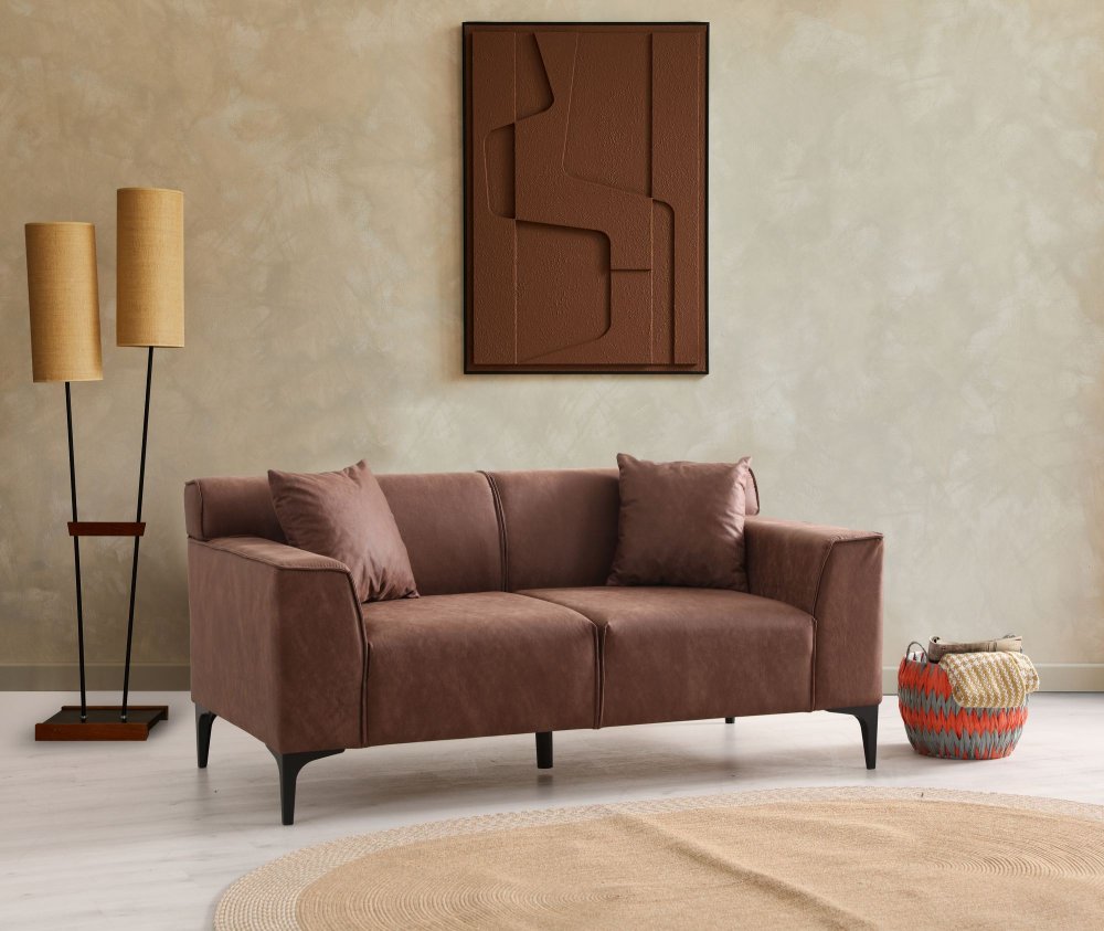 Ram dvoseda izrađen je od kombinacije bukovog drveta i iverice, što garantuje čvrstoću konstrukcije. Tapaciran je tkaninom od 100% poliestera, koja je pogodna za suvo čišćenje i otporna na svakodnevno habanje. Dva jastuka dolaze uz dvosed, upotpunjujući izgled i dodatno povećavajući udobnost. Crne čvrste plastične nogare obezbeđuju stabilnost i jednostavno održavanje poda.