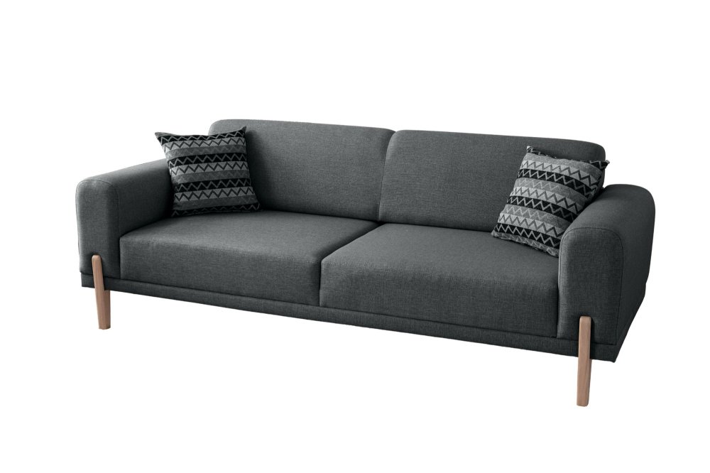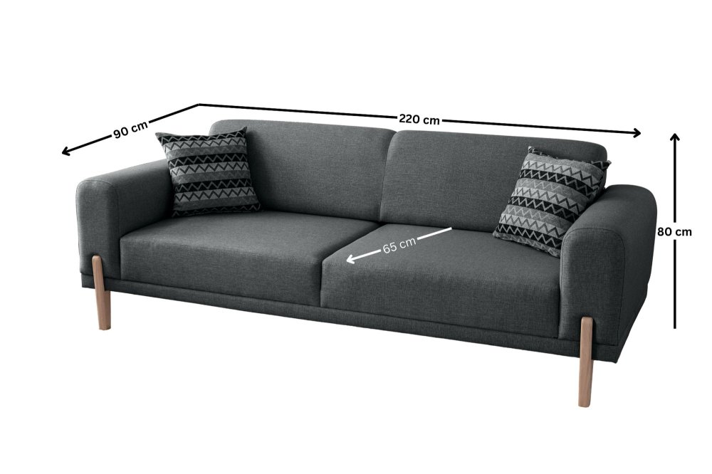 | Specifikacija | Sofa trosed na razvlačenje Materijal rama: 70% Grab / 30% Iverica presvučena melaminom Materijal tkanine: 100% Poliester Tekstura tkanine: Lan Materijal nogara: Drvo Punjenje: 32 DNS sunđer Debljina sunđera: 20 cm Dimenzije: Širina: 220 cm Visina: 80 cm Dubina: 90 cm Visina naslona za ruke: 67 cm Visina nogara: 16 cm Maksimalno opterećenje: 240 kg Ostalo: Uključena su 2 jastuka |