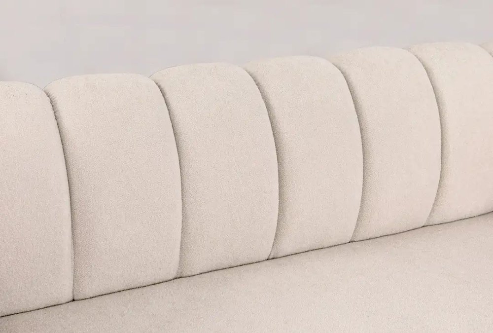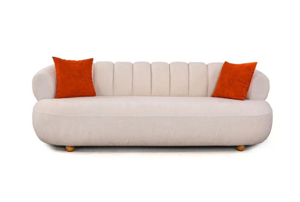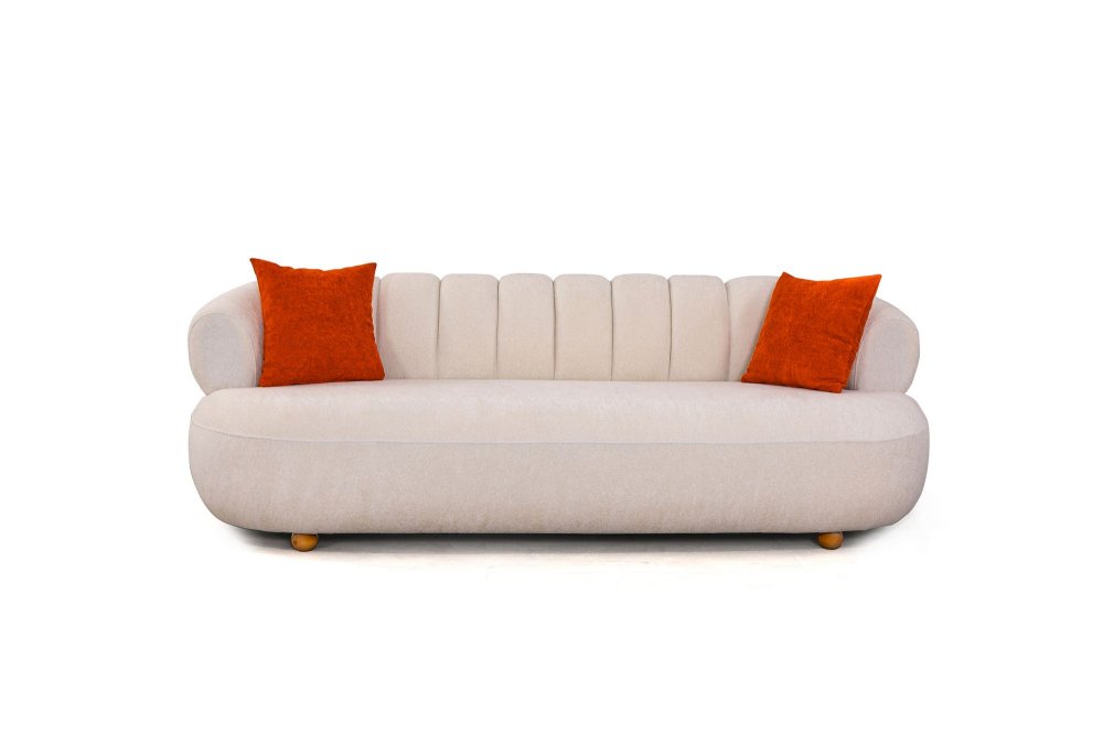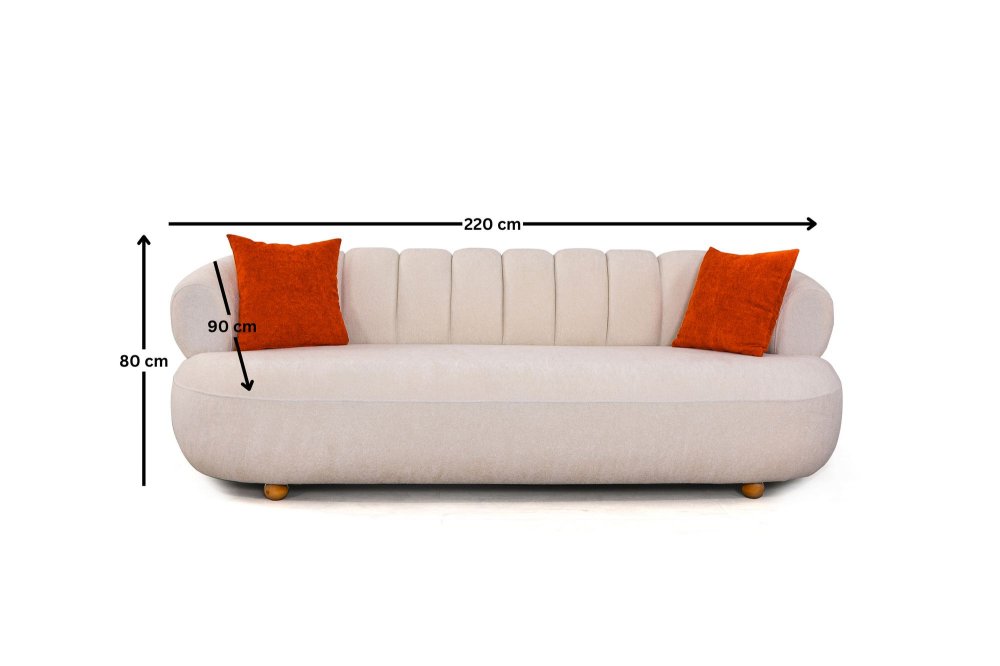 | Specifikacija | Sofa trosed Materijal rama: 70% Grab / 30% Iverica presvučena melaminom Materijal tkanine: 100% Poliester Tekstura tkanine: Bukle Materijal nogara: Drvo Punjenje: 30 DNS sunđer Debljina sunđera: 20 cm Dimenzije: Širina: 220 cm Visina: 80 cm Dubina: 90 cm Širina sedišta: 185 cm Visina sedišta: 50 cm Dubina sedišta: 65 cm Visina naslona za ruke: 66 cm Visina nogara: 6 cm Maksimalno opterećenje: 240 kg Ostalo: Uključena su 2 jastuka |