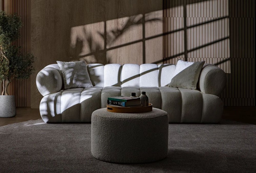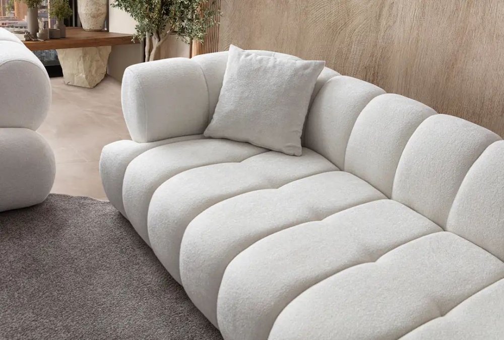 | Specifikacija | Sofa trosed Materijal rama: 70% Grab / 30% Iverica presvučena melaminom Materijal tkanine: 100% Poliester Tekstura tkanine: Bukle Materijal nogara: Plastika Punjenje: 32 DNS sunđer Debljina sunđera: 20 cm Dimenzije: Širina: 230 cm Visina: 70 cm Dubina: 70 cm Visina naslona za ruke: 70 cm Visina nogara: 1.5 cm Maksimalno opterećenje: 240 kg Ostalo: Uključena su 2 jastuka |