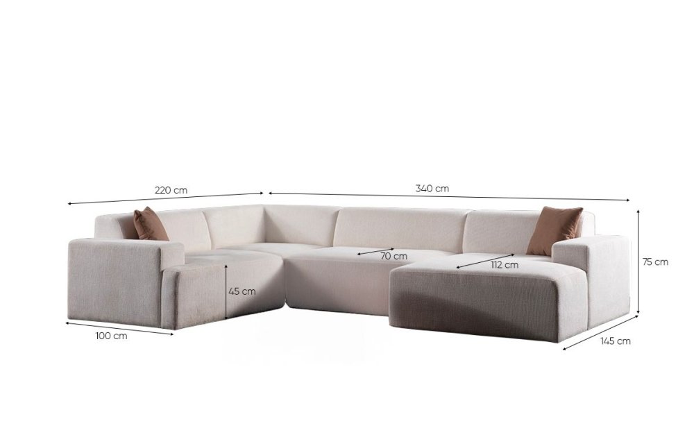 Specifikacija | Ugaona sofa Melva (L15 + C + O2 + Chl Rıght) Okvir: Drvo / Iverica Tkanina: 100% Poliester Dužina: 220 x 340 x 145 Širina: 100 cm Visina: 75 cm Pena: 28 DNS pena Tkanina za hemijsko čišćenje Nogare: plastika 3 cm |