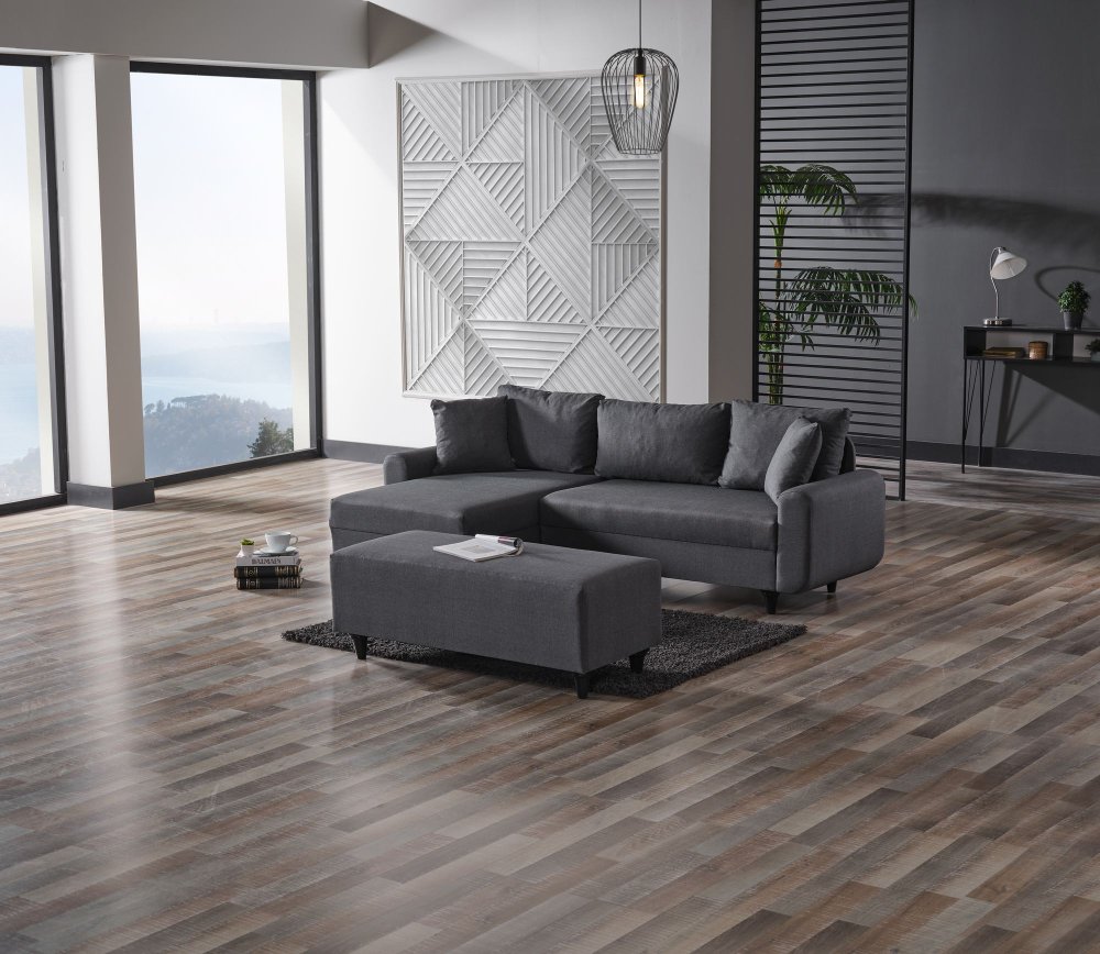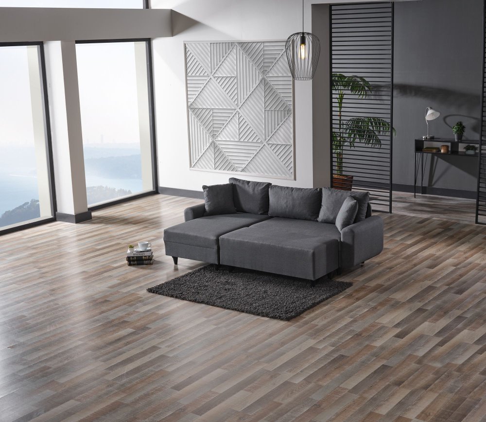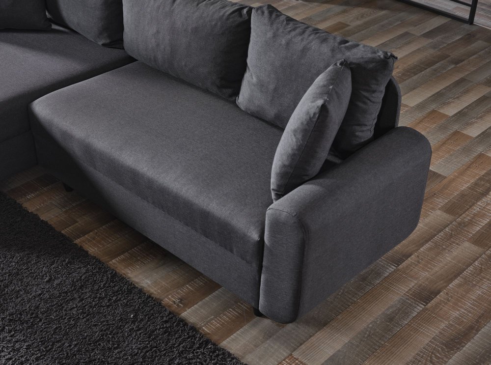Ugaona sofa-krevet Flavia Dark Grey donosi savršenu ravnotežu između modernog dizajna, funkcionalnosti i udobnosti. Njena tamnosiva nijansa (Dark Grey) daje prostoru sofisticiran i elegantan izgled, dok ugaoni oblik omogućava maksimalno iskorišćenje prostora — idealno rešenje za savremene domove, garsonjere ili manje dnevne sobe.
