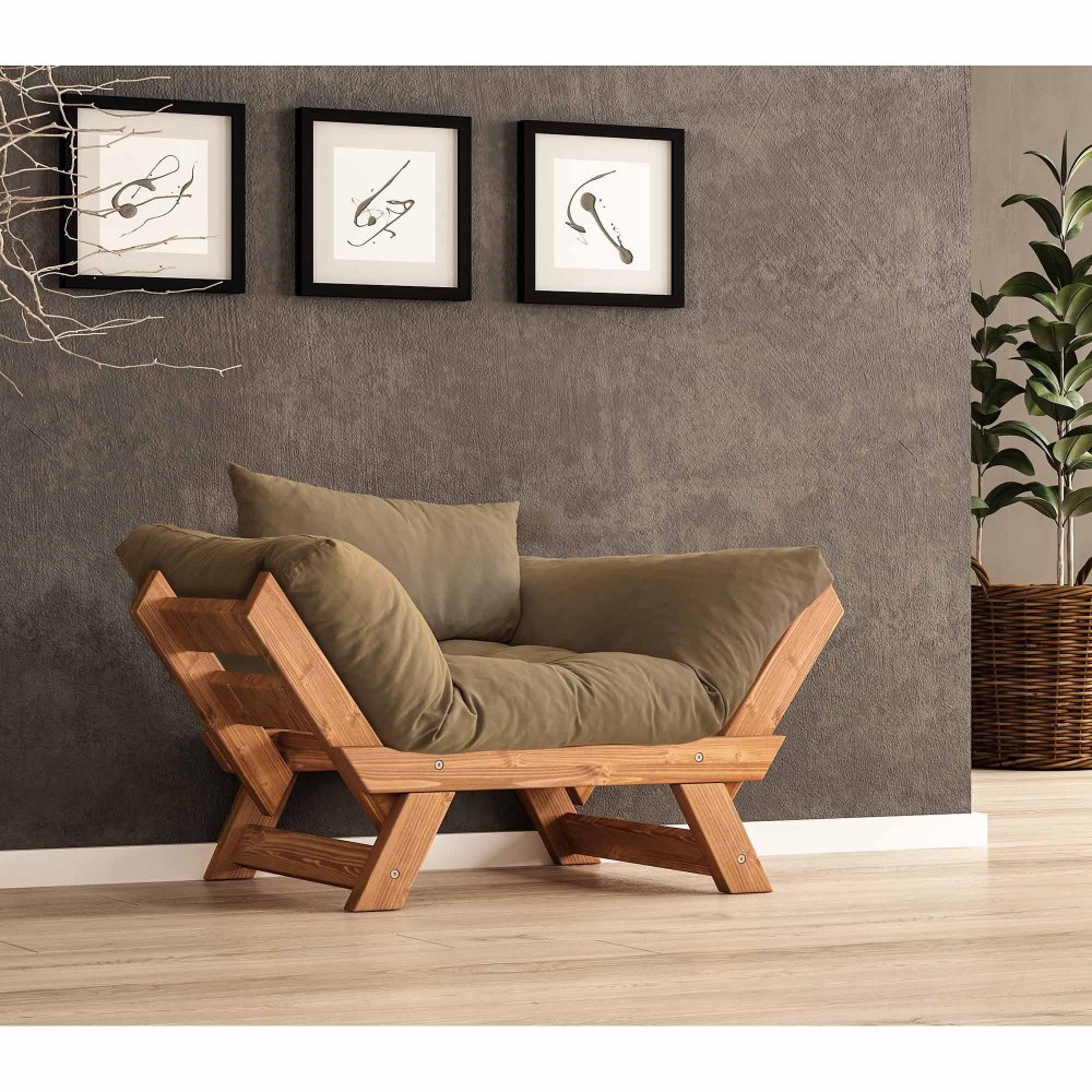 Kombinacija prirodnog borovog okvira i kamel nijanse daje sofisticiran, ali i prijatan i prirodan izgled — idealan za baštenski ili terasni ambijent koji teži harmoniji sa prirodom.