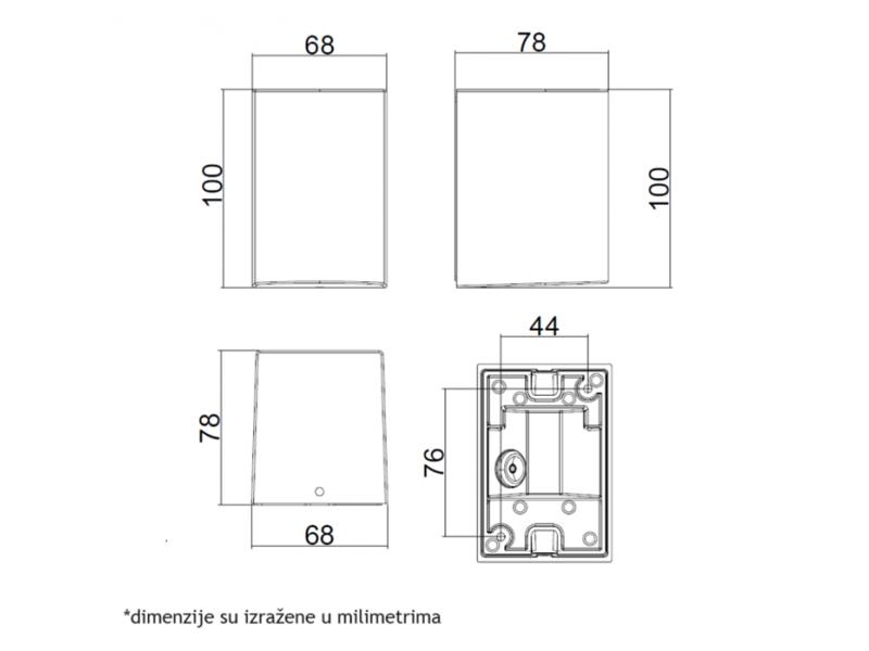 | Karakteristike | Model: W10411 Nazivni napon: 220-240V AC / 50/60Hz Tip grla: GU10 Broj grla: 1 Izvor svetlosti: Sijalica (izmenjiva) Materijal: Aluminijum Dimenzije: 68 x 78 x 100 mm Način montaže: Nadgradna Stepen električne zaštite: Klasa I IP zaštita: IP65 |