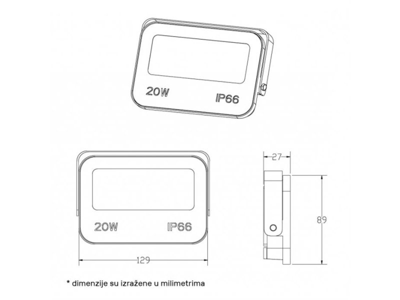| Karakteristike | Model: GN-FL913-20W Nazivni napon: 185-265 V AC Nazivna snaga: 20 W Temperatura boje svetlosti: 3000 K - 4000 K - 6500 K Svetlosni fluks: 1600 lm Izvor svetlosti: LED Materijal: Aluminijum Dimenzije: 129 x 89 x 27 mm Način montaže: Nadgradna Ugao rasipanja svetlosti: 110° Indeks reprodukcije boje (CRI): ≥80(Ra) Faktor snage (Pf): 0.9 Temperatura okruženja: -20°C do +40°C Prosečan radni vek: 25000 h Stepen električne zaštite: Klasa I IP zaštita: IP66 Potrošnja električne energije: 20 kWh / 1000h |