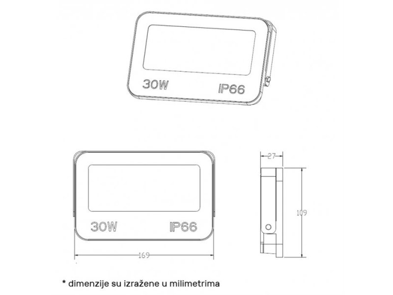 | Karakteristike | Model: GN-FL913-30W Nazivni napon: 185-265 V AC Nazivna snaga: 30 W Temperatura boje svetlosti: 3000 K - 4000 K - 6500 K Svetlosni fluks: 3000 lm Izvor svetlosti: LED Materijal: Aluminijum / Staklo Dimenzije: 169 x 109 x 27 mm Način montaže: Nadgradna Ugao rasipanja svetlosti: 110° Indeks reprodukcije boje (CRI): ≥80(Ra) Faktor snage (Pf): 0.9 Temperatura okruženja: -20°C do +40°C Prosečan radni vek: 25000 h Stepen električne zaštite: Klasa I IP zaštita: IP66 Potrošnja električne energije: 30 kWh / 1000h |