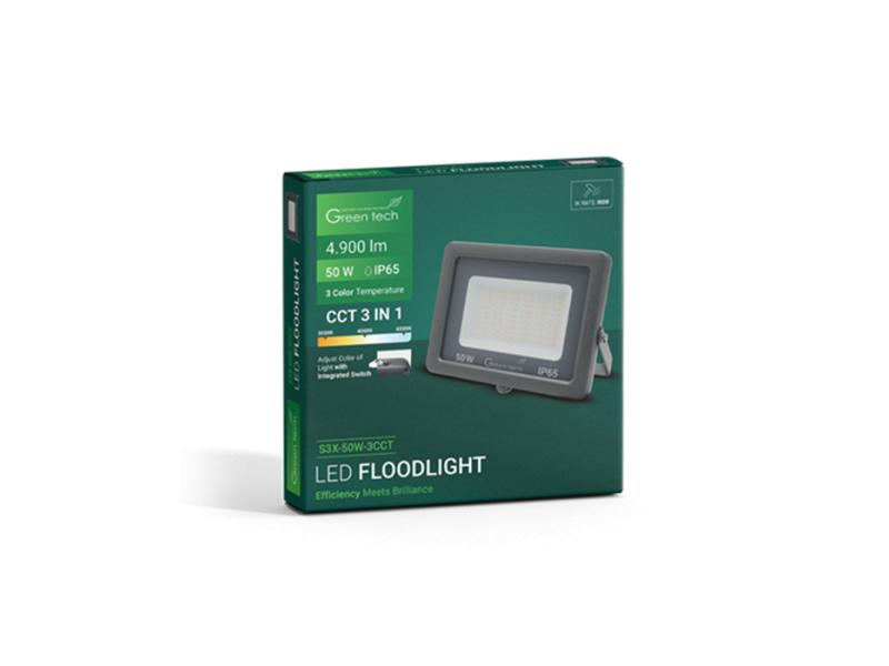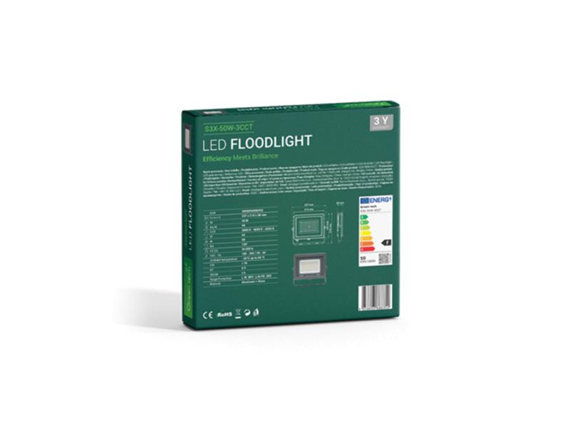 | Karakteristike | Snaga: 50 W Boja svetlosti: 3000 K - 4000 K - 6500 K (odabir boje svetlosti pomoću integrisanog prekidača) IP stepen zaštite: IP65 IK stepen zaštite: IK08 Napon: AC 185 - 265 V / 50 - 60 Hz Zaštita od prenapona: L-N: 3KV; L/N-PE: 2KV Flux: 98 lm / W Ukupan tok svetlosti: 4900 lm Ugao svetlosti: 120° CRI: ≥ 70 DF: 0.9 SCDM: ≤ 6 Vek trajanja: 36 000 radnih sati Materijal: Aluminijum + staklo Radna temperatura: od -40°C do 50°C Neto težina: 1,073 kg Bruto težina: 1,178 kg Dimenzije artikla: 237 x 210 x 38 mm Dimenzije pakovanja: 242 x 43 x 217 mm Sertifikati: CE, RoHS |