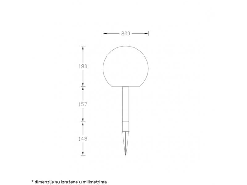 | Karakteristike | Model: SOLEA 51 Nazivna snaga: 2 x 0.2 W Temperatura boje svetlosti: 4000 K Svetlosni fluks: 20 lm Izvor svetlosti: LED Materijal: Plastika Dimenzije: Ø200 x 485 mm Način montaže: Ubodna (u zemlju) Baterija: 3.2V, 600mAh LiFePo, 14500 IP zaštita: IP65 |