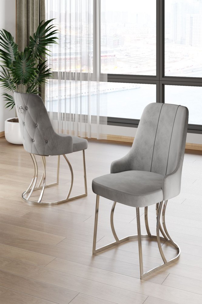 | Karakteristike | Set stolica (4 dela) Puva Grey Chrome 100% METAL Tkanina: Mekana tkanina Širina: 44 cm Visina: 98 cm Dubina: 46 cm (4 komada) Visina sedišta: 50 cm 18 DNS pena za leđa / 22 DNS pena za sedenje Metalne nogare Broj pakovanja: 3 85 x 59 x 50 cm / 24 kg (1 komad) 45 x 48 x 63 cm / 6 kg (2 komada) |