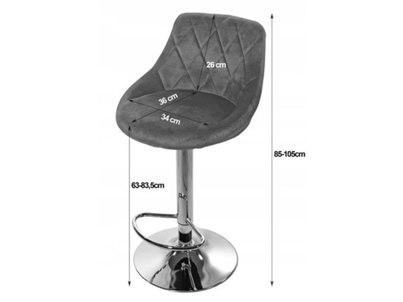 | Karakteristike | Dimenzije: Podesiva visina stolice: 85 – 105 cm Podesiva visina sedišta: 63 – 83,5 cm Širina stolice: 45,5 cm Dubina stolice: 49 cm Širina sedišta: 34 cm Dubina sedišta: 36 cm Specifikacije: Materijal sedišta: velur Baza: metalna, zlatna Težina: 5,9 kg Maksimalno opterećenje: 110 kg |