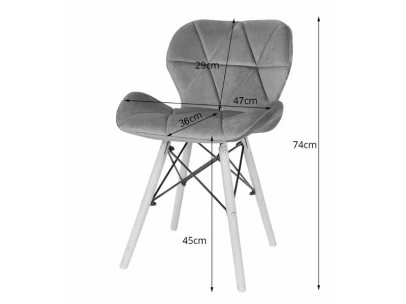 | Karakteristike | Dimenzije: Visina stolice: 74 cm Širina stolice: 47 cm Dubina stolice: 52,5 cm Visina sedišta: 45 cm Širina sedišta: 47 cm Dubina sedišta: 36 cm Specifikacije: Materijal sedišta: mekani velur za luksuzan osećaj Noge: bukovo drvo Težina: oko 4,05 kg po stolici Maksimalno opterećenje: 110 kg |