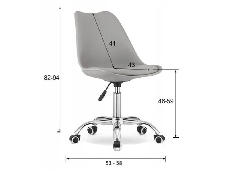 | Karakteristike | Dimenzije: Ukupna visina stolice: 94 cm Podesiva visina sedišta: 46 – 59 cm Širina sedišta: 48 cm Dubina sedišta: 43 cm Širina krsta: 53 – 58 cm Specifikacije: Materijal sedišta: polipropilen sa jastučićem od eko-kože Baza: hromirana Težina: oko 5,1 kg Maksimalno opterećenje: 110 kg |