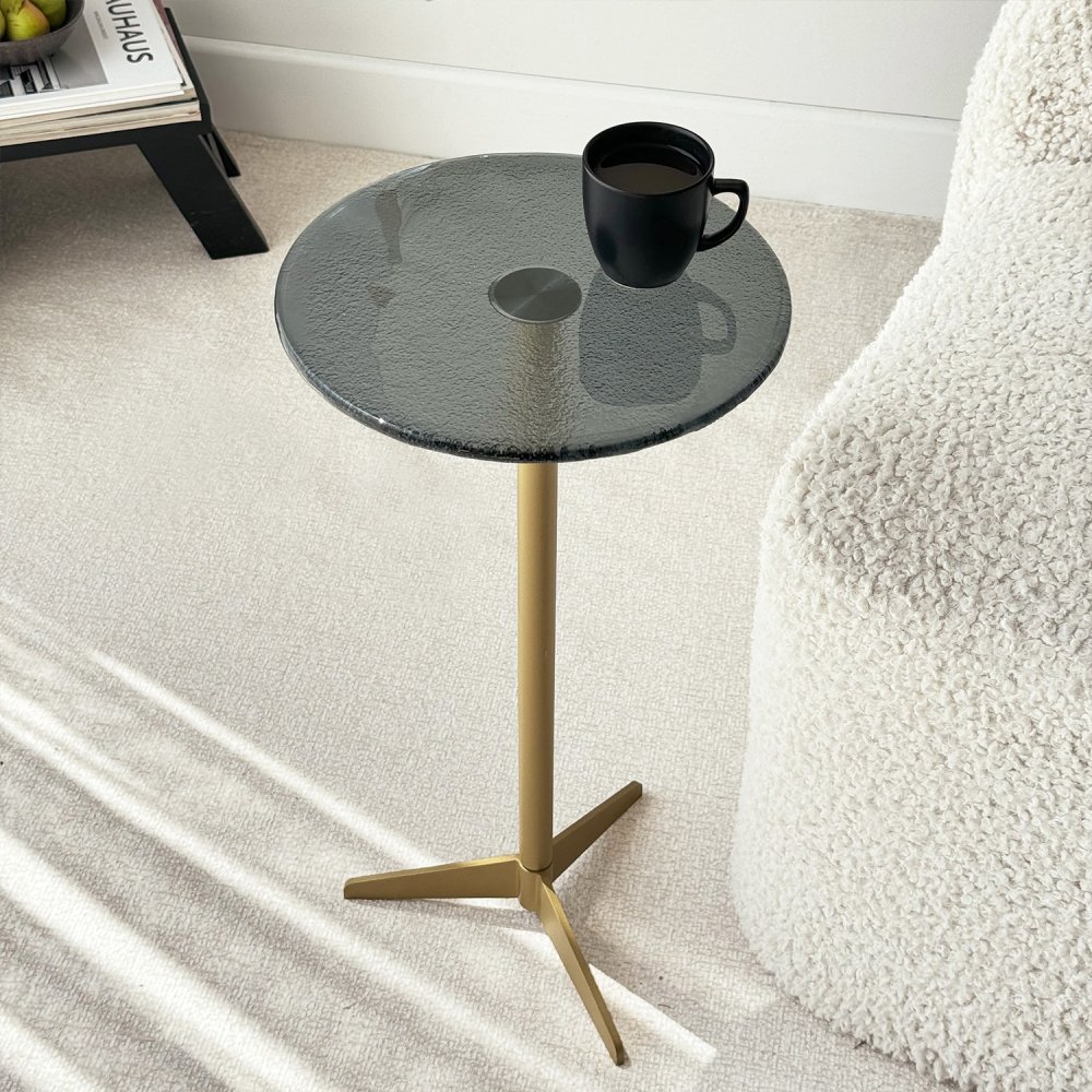 Specifikacija | Pomoćni stočić Materijal: 100% kaljeno staklo Materijal okvira: 100% Metal Dimenzije: Širina: 25 cm Visina: 50 cm Dubina: 25 cm |