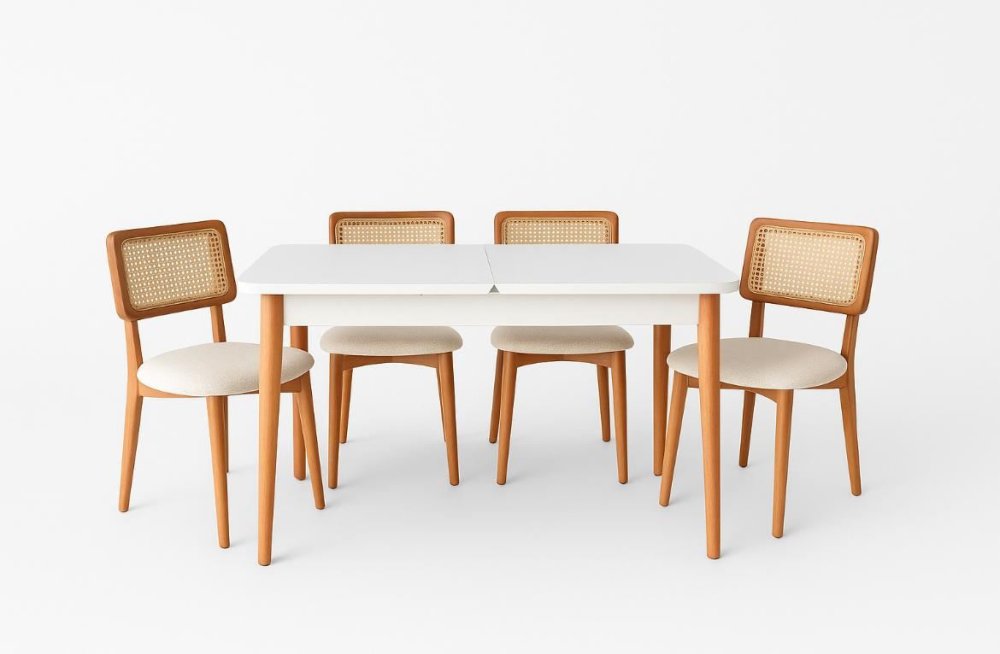 | Specifikacija | Produžni set trpezarijskih stolova i stolica (5 komada) 100% Bukovo drvo Vrh tabele: 100% Melaminska iverica (otporna na ogrebotine) Tkanina: 100% Poliester širina Bouclette tekstura Sto: Širina: 127 cm Visina: 75 cm Dubina: 70 cm Otvoreni sto: Širina: 156 cm Visina: 75 cm Dubina: 70 cm Stolica: Širina: 45 cm Visina: 81 cm Dubina: 46 cm (4 komada) |
