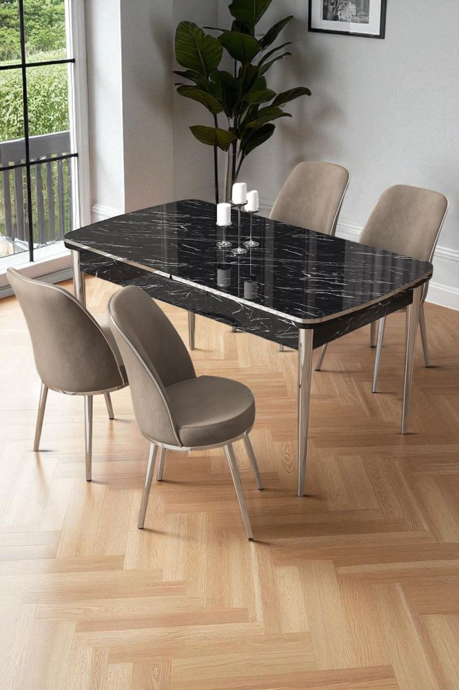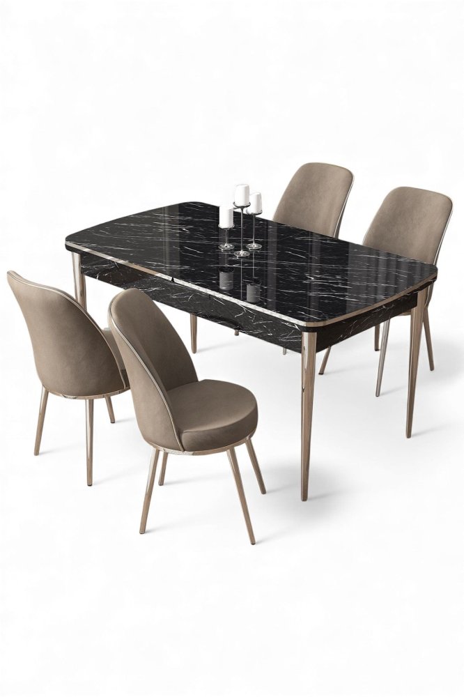 | Specifikacija | Rasklopivi trpezarijski sto i stolice (5 delova) Nira Black Marble Chrome Cappuccino 100% MDF Metalne nogare Okvir stolice: METAL Materijal: Mekana tkanina Trpezarijski sto: Širina: 114 cm Visina: 78 cm Dubina: 78 cm (1 komad) Otvoreni trpezarijski sto: Širina: 144 cm Visina: 78 cm Dubina: 70 cm Stolica: Širina: 45 cm Visina: 91 cm Dubina: 42 cm (4 komada) Visina sedišta: 47 cm 22 DNS pena za leđa / 28 DNS pena za sedenje Broj pakovanja: 3 118,5 x 77 x 20 cm / 25,76 kg (1 komad) 77 x 58 x 49 cm / 16 kg (1 komad) 63 x 49 x 45 cm / 8 kg (1 komad) |