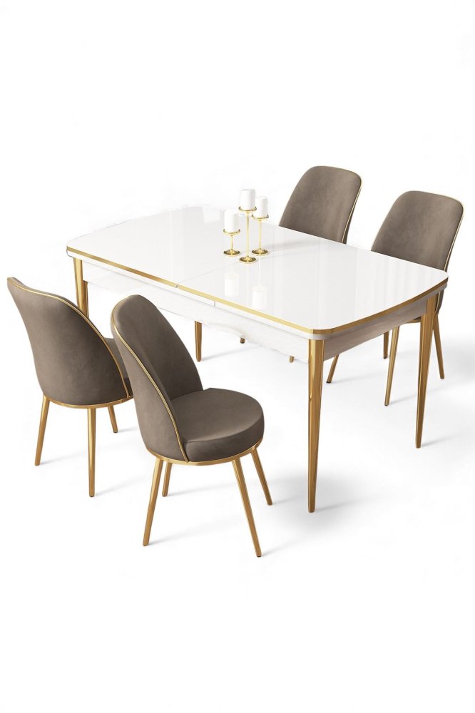 | Specifikacija | Rasklopivi trpezarijski sto i stolice (5 delova) Nira White Gold Cappuccino 100% MDF Metalne nogare Okvir stolice: METAL Materijal: Mekana tkanina Trpezarijski sto: Širina: 114 cm Visina: 78 cm Dubina: 78 cm (1 komad) Otvoreni trpezarijski sto: Širina: 144 cm Visina: 78 cm Dubina: 70 cm Stolica: Širina: 45 cm Visina: 91 cm Dubina: 42 cm (4 komada) Visina sedišta: 47 cm 22 DNS pena za leđa / 28 DNS pena za sedenje Broj pakovanja: 3 118,5 x 77 x 20 cm / 25,76 kg (1 komad) 77 x 58 x 49 cm / 16 kg (1 komad) 63 x 49 x 45 cm / 8 kg (1 komad) |