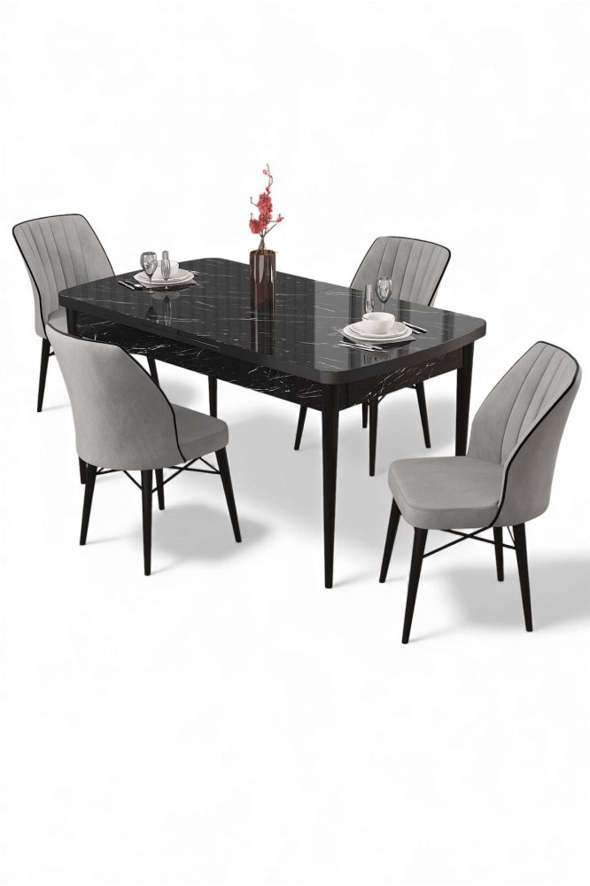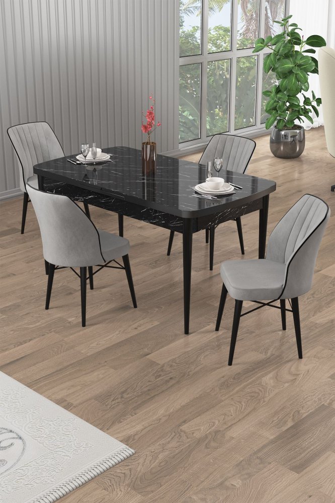 | Specifikacija | Rasklopivi trpezarijski sto i stolice (5 delova) Uzi Black Marble Grey 100% Iverica sa melaminskim premazom Drvene nogare Okvir stolice: Metal Materijal: Mekana tkanina Trpezarijski sto: Širina: 132 cm Visina: 78 cm Dubina: 80 cm (1 komad) Otvoreni trpezarijski sto: Širina: 170 cm Visina: 78 cm Dubina: 80 cm Stolica: Širina: 45 cm Visina: 93 cm Dubina: 42 cm (4 komada) Visina sedišta: 48 cm 22 DNS pena za leđa / 28 DNS pena za sedenje Broj pakovanja: 3 85 x 136 x 20 cm / 31,18 kg (1 komad) 77 x 58 x 49 cm / 17 kg (1 komad) 36 x 37 x 45 cm / 8 kg (1 komad) |