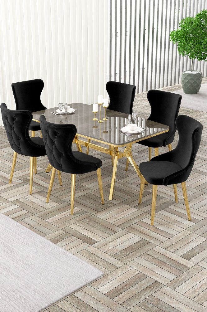 | Specifikacija | Rasklopivi trpezarijski sto i stolice (7 delova) Esla Anthracite Gold Black 100% LAKOVANI PANEL Metalne nogare Okvir stolice: ŠPERPLOČA / METAL Materijal: Mekana tkanina Trpezarijski sto: Širina: 160 cm Visina: 75 cm Dubina: 90 cm (1 komad) Stolica: Širina: 45 cm Visina: 91 cm Dubina: 46 cm (6 komada) Visina sedišta: 47 cm 22 DNS pena za leđa / 28 DNS pena za sedenje Broj pakovanja: 5 169 x 99,5 x 10,5 cm / 25,76 kg (1 komad) 37,5 x 80 x 19 cm / 7,58 kg (1 komad) 85 x 59 x 50 cm / 22 kg (1 komad) 62 x 48 x 56 cm / 12 kg (1 komad) 62 x 48 x 56 cm / 14 kg (1 komad) |