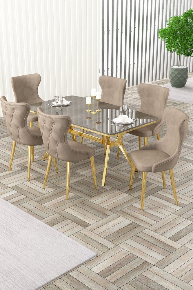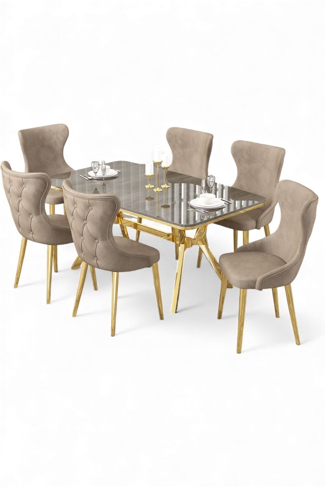 | Specifikacija | Rasklopivi trpezarijski sto i stolice (7 delova) Esla Anthracite Gold Cappuccino 100% LAKOVANI PANEL Metalne nogare Okvir stolice: ŠPERPLOČA / METAL Materijal: Mekana tkanina Trpezarijski sto: Širina: 160 cm Visina: 75 cm Dubina: 90 cm (1 komad) Stolica: Širina: 45 cm Visina: 91 cm Dubina: 46 cm (6 komada) Visina sedišta: 47 cm 22 DNS pena za leđa / 28 DNS pena za sedenje Broj pakovanja: 5 169 x 99,5 x 10,5 cm / 25,76 kg (1 komad) 37,5 x 80 x 19 cm / 7,58 kg (1 komad) 85 x 59 x 50 cm / 22 kg (1 komad) 62 x 48 x 56 cm / 12 kg (1 komad) 62 x 48 x 56 cm / 14 kg (1 komad) |