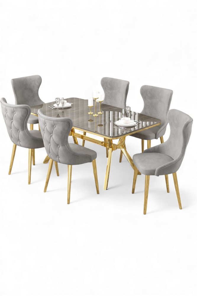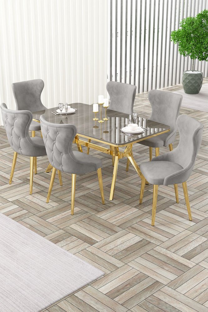 | Specifikacija | Rasklopivi trpezarijski sto i stolice (7 delova) Esla Anthracite Gold Grey 100% LAKOVANI PANEL Metalne nogare Okvir stolice: ŠPERPLOČA / METAL Materijal: Mekana tkanina Trpezarijski sto: Širina: 160 cm Visina: 75 cm Dubina: 90 cm (1 komad) Stolica: Širina: 45 cm Visina: 91 cm Dubina: 46 cm (6 komada) Visina sedišta: 47 cm 22 DNS pena za leđa / 28 DNS pena za sedenje Broj pakovanja: 5 169 x 99,5 x 10,5 cm / 25,76 kg (1 komad) 37,5 x 80 x 19 cm / 7,58 kg (1 komad) 85 x 59 x 50 cm / 22 kg (1 komad) 62 x 48 x 56 cm / 12 kg (1 komad) 62 x 48 x 56 cm / 14 kg (1 komad) |