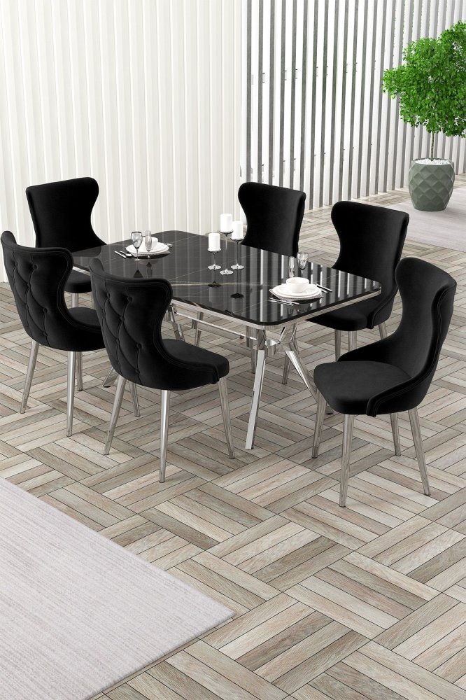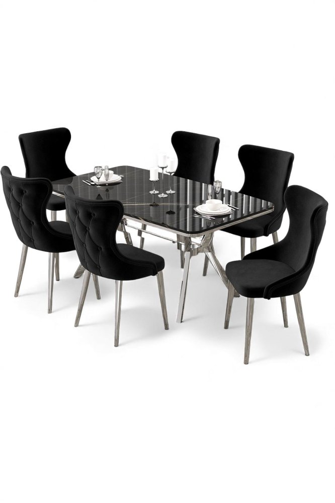 | Specifikacija | Rasklopivi trpezarijski sto i stolice (7 delova) Esla Black Marble Chrome Black 100% LAKOVANI PANEL Metalne nogare Okvir stolice: ŠPERPLOČA / METAL Materijal: Mekana tkanina Trpezarijski sto: Širina: 160 cm Visina: 75 cm Dubina: 90 cm (1 komad) Stolica: Širina: 45 cm Visina: 91 cm Dubina: 46 cm (6 komada) Visina sedišta: 47 cm 22 DNS pena za leđa / 28 DNS pena za sedenje Broj pakovanja: 5 169 x 99,5 x 10,5 cm / 25,76 kg (1 komad) 37,5 x 80 x 19 cm / 7,58 kg (1 komad) 85 x 59 x 50 cm / 22 kg (1 komad) 62 x 48 x 56 cm / 12 kg (1 komad) 62 x 48 x 56 cm / 14 kg (1 komad) |