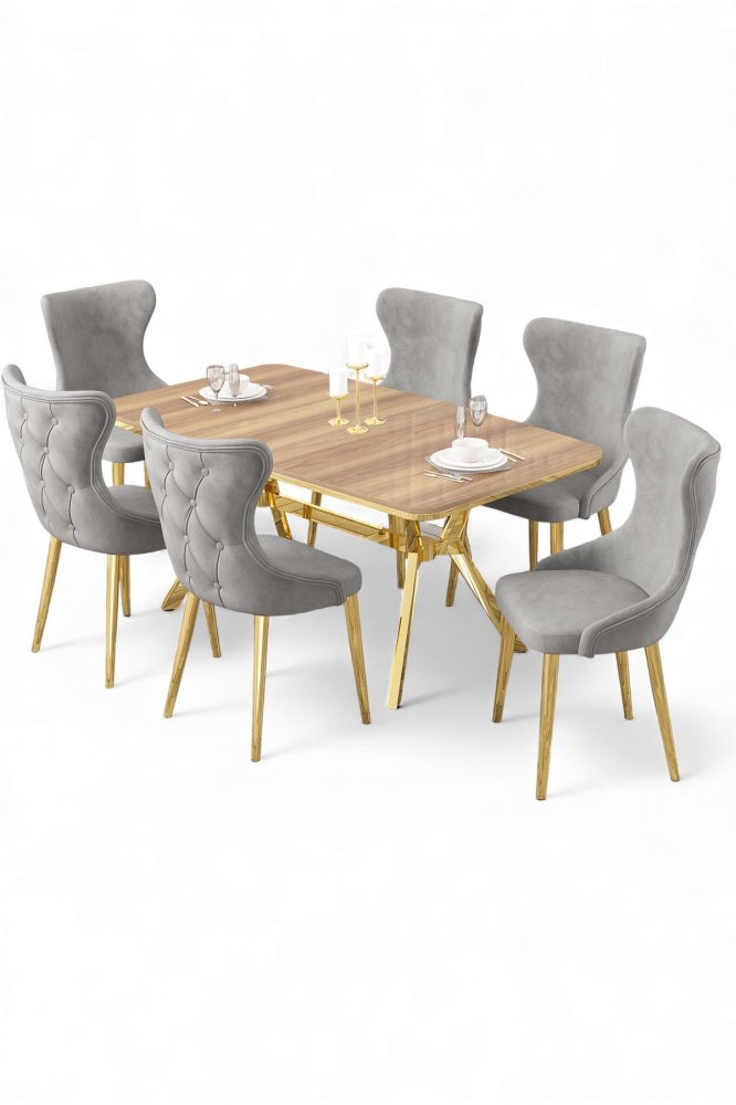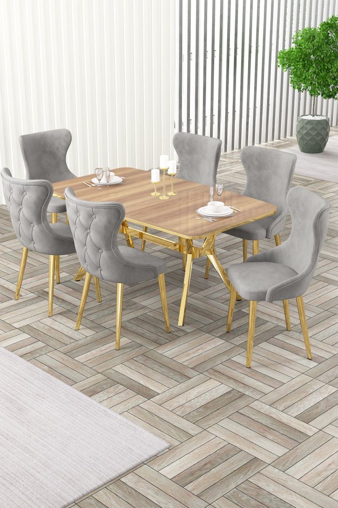 | Specifikacija | Rasklopivi trpezarijski sto i stolice (7 delova) Esla Hrast Gold Grey 100% LAKOVANI PANEL Metalne nogare Okvir stolice: ŠPERPLOČA / METAL Materijal: Mekana tkanina Trpezarijski sto: Širina: 160 cm Visina: 75 cm Dubina: 90 cm (1 komad) Stolica: Širina: 45 cm Visina: 91 cm Dubina: 46 cm (6 komada) Visina sedišta: 47 cm 22 DNS pena za leđa / 28 DNS pena za sedenje Broj pakovanja: 5 169 x 99,5 x 10,5 cm / 25,76 kg (1 komad) 37,5 x 80 x 19 cm / 7,58 kg (1 komad) 85 x 59 x 50 cm / 22 kg (1 komad) 62 x 48 x 56 cm / 12 kg (1 komad) 62 x 48 x 56 cm / 14 kg (1 komad) |