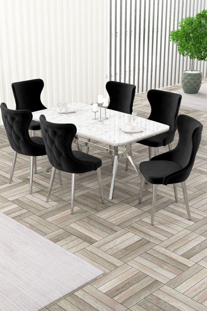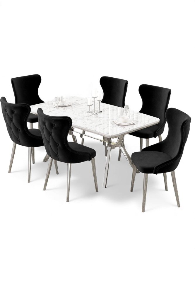 | Specifikacija | Rasklopivi trpezarijski sto i stolice (7 delova) Esla White Marble Chrome Black 100% LAKOVANI PANEL Metalne nogare Okvir stolice: ŠPERPLOČA / METAL Materijal: Mekana tkanina Trpezarijski sto: Širina: 160 cm Visina: 75 cm Dubina: 90 cm (1 komad) Stolica: Širina: 45 cm Visina: 91 cm Dubina: 46 cm (6 komada) Visina sedišta: 47 cm 22 DNS pena za leđa / 28 DNS pena za sedenje Broj pakovanja: 5 169 x 99,5 x 10,5 cm / 25,76 kg (1 komad) 37,5 x 80 x 19 cm / 7,58 kg (1 komad) 85 x 59 x 50 cm / 22 kg (1 komad) 62 x 48 x 56 cm / 12 kg (1 komad) 62 x 48 x 56 cm / 14 kg (1 komad) |