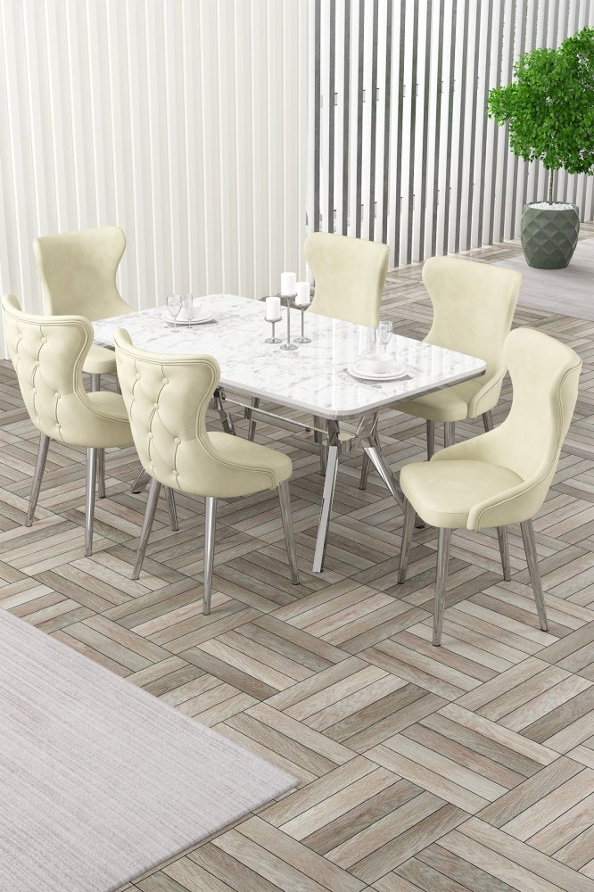 | Specifikacija | Rasklopivi trpezarijski sto i stolice (7 delova) Esla White Marble Chrome Cream 100% LAKOVANI PANEL Metalne nogare Okvir stolice: ŠPERPLOČA / METAL Materijal: Mekana tkanina Trpezarijski sto: Širina: 160 cm Visina: 75 cm Dubina: 90 cm (1 komad) Stolica: Širina: 45 cm Visina: 91 cm Dubina: 46 cm (6 komada) Visina sedišta: 47 cm 22 DNS pena za leđa / 28 DNS pena za sedenje Broj pakovanja: 5 169 x 99,5 x 10,5 cm / 25,76 kg (1 komad) 37,5 x 80 x 19 cm / 7,58 kg (1 komad) 85 x 59 x 50 cm / 22 kg (1 komad) 62 x 48 x 56 cm / 12 kg (1 komad) 62 x 48 x 56 cm / 14 kg (1 komad) |