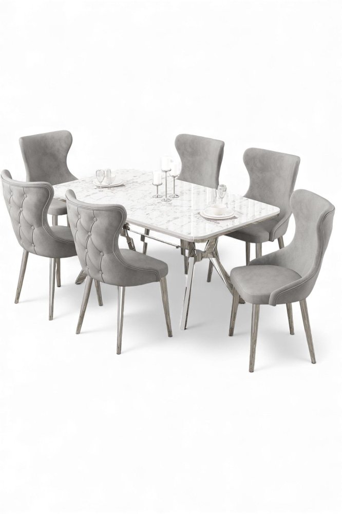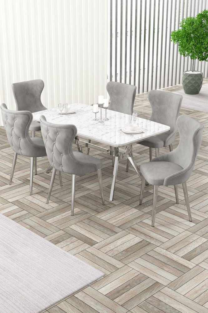 | Specifikacija | Rasklopivi trpezarijski sto i stolice (7 delova) Esla White Marble Chrome Grey 100% LAKOVANI PANEL Metalne nogare Okvir stolice: ŠPERPLOČA / METAL Materijal: Mekana tkanina Trpezarijski sto: Širina: 160 cm Visina: 75 cm Dubina: 90 cm (1 komad) Stolica: Širina: 45 cm Visina: 91 cm Dubina: 46 cm (6 komada) Visina sedišta: 47 cm 22 DNS pena za leđa / 28 DNS pena za sedenje Broj pakovanja: 5 169 x 99,5 x 10,5 cm / 25,76 kg (1 komad) 37,5 x 80 x 19 cm / 7,58 kg (1 komad) 85 x 59 x 50 cm / 22 kg (1 komad) 62 x 48 x 56 cm / 12 kg (1 komad) 62 x 48 x 56 cm / 14 kg (1 komad) |