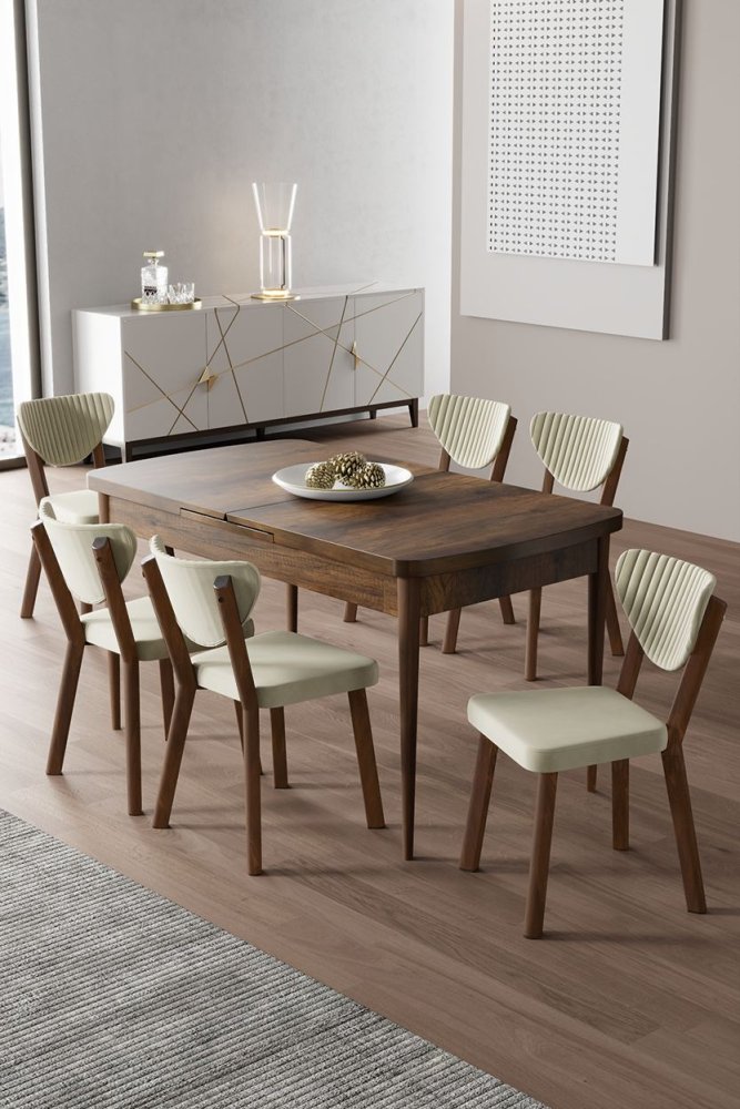 | Specifikacija | Rasklopivi trpezarijski sto i stolice (7 delova) Exve Baroque Cream 100% Iverica sa melaminskim premazom Metalne nogare Okvir stolice: Šperploča / Metal Materijal: Mekana tkanina Trpezarijski sto: Širina: 132 cm Visina: 78 cm Dubina: 80 cm (1 komad) Otvoreni trpezarijski sto: Širina: 170 cm Visina: 78 cm Dubina: 80 cm Stolica: Širina: 45 cm Visina: 86 cm Dubina: 46 cm (7 komada) Visina sedišta: 48 cm 22 DNS pena za leđa / 28 DNS pena za sedenje Broj pakovanja: 2 85 x 136 x 20 cm / 30,42 kg (1 komad) 101 x 76 x 26 cm / 30 kg (1 komad) |