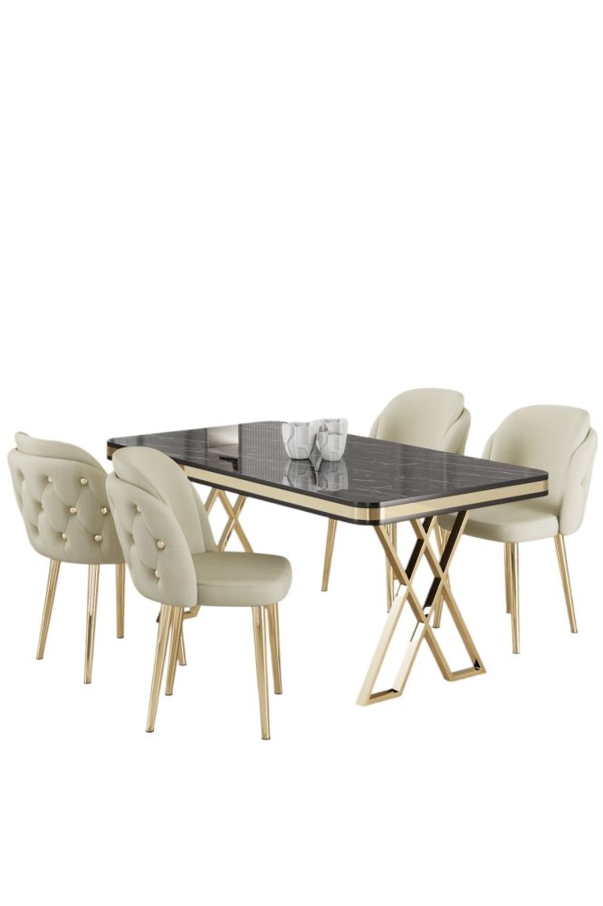 HANAH HOME Set Trpezarijski sto i 4 stolice Rigel Black Marble Gold Cream