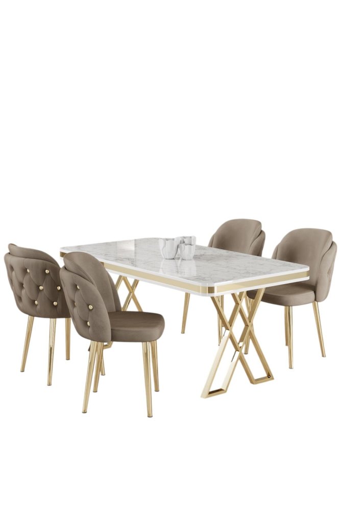 | Specifikacija |  Trpezarijski set: Sto i 4 stolice Materijal ploče stola: 100% Lakirana ploča Materijal nogara stola: Metal Materijal okvira stolica: Iverica Materijal nogara stolica: Metal Materijal tkanine: Babyface tkanina Punjenje sedišta: 28 DNS pena Punjenje naslona: 22 DNS pena Dimenzije stola: Širina: 130 cm Visina: 74 cm Dubina: 80 cm Dimenzije stolice: Širina: 46 cm Visina: 82 cm Dubina: 45 cm Visina sedišta: 48 cm Broj stolica u setu: 4  |