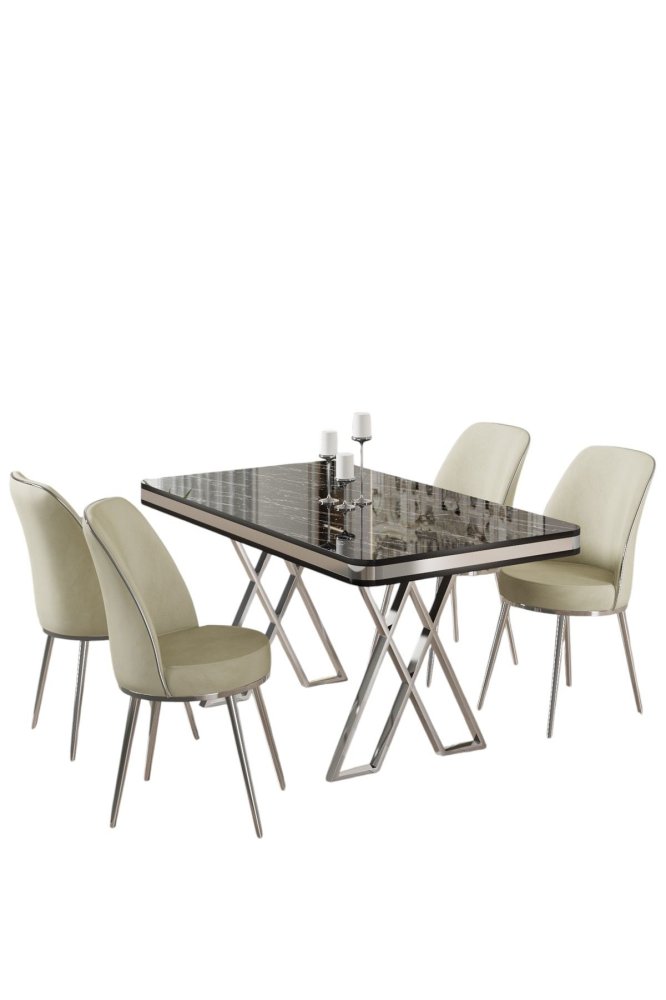 HANAH HOME Set Trpezarijski sto i 4 stolice Vals Black Marble Chrome Cream