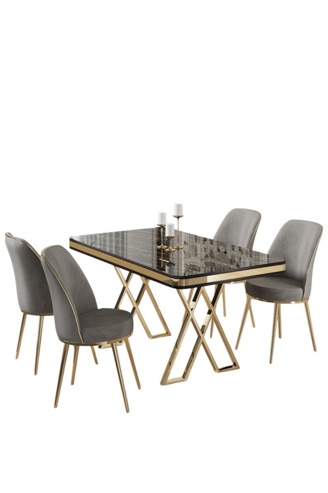 | Specifikacija |  Trpezarijski set: Sto i 4 stolice Materijal ploče stola: 100% Lakirana ploča Materijal nogara: Metal Materijal okvira stolica: Metal Materijal tkanine: Babyface tkanina Punjenje sedišta: 28 DNS pena Punjenje naslona: 22 DNS pena Dimenzije stola: Širina: 130 cm Visina: 74 cm Dubina: 80 cm Dimenzije stolice: Širina: 45 cm Visina: 91 cm Dubina: 42 cm Visina sedišta: 47 cm Broj stolica u setu: 4  |