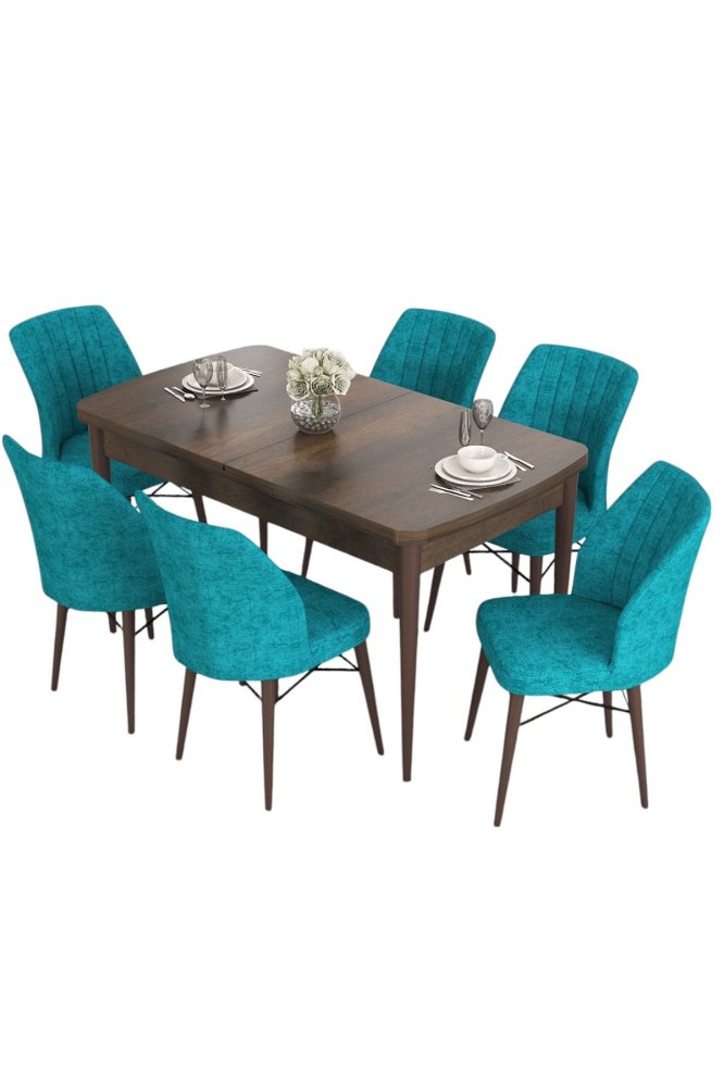 | Specifikacija |  Trpezarijski set: Sto i 6 stolica Materijal ploče stola: 100% Medijapan Materijal nogara stola: Drvo Materijal okvira stolica: Metal Materijal nogara stolica: Drvo Materijal tkanine: Jerry tkanina Punjenje sedišta: 28 DNS pena Punjenje naslona: 22 DNS pena Dimenzije stola: Širina: 132 cm Visina: 78 cm Dubina: 80 cm Dimenzije razvučenog stola: Širina: 170 cm Visina: 78 cm Dubina: 80 cm Dimenzije stolice: Širina: 45 cm Visina: 90 cm Dubina: 42 cm Visina sedišta: 46 cm Broj stolica u setu: 6  |