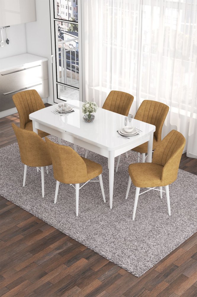 | Specifikacija |    Trpezarijski sto i stolice čine savršen spoj udobnosti i stila za svaki obrok u tvom domu. Praktičan i estetski usklađen set pretvara svakodnevna okupljanja u prijatne i posebne trenutke.   • Materijal: MDF   • Noge: Drvene   • Okvir stolice: Metal   • Tkanina: Jerry   • Sto: Širina: 132 cm Visina: 78 cm Dubina: 80 cm   • Sto (otvoren): Širina: 170 cm Visina: 78 cm Dubina: 80 cm   • Stolice (6 komada): Širina: 45 cm Visina: 90 cm Dubina: 42 cm   • Visina sedišta: 46 cm   • Pena za naslon: 22 DNS   • Pena za sedište: 28 DNS   |