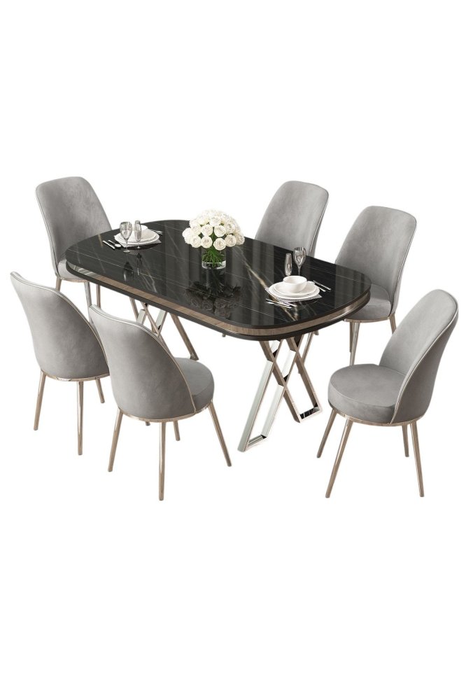 HANAH HOME Set Trpezarijski sto i 6 stolica Lai Black Marble Chrome Grey