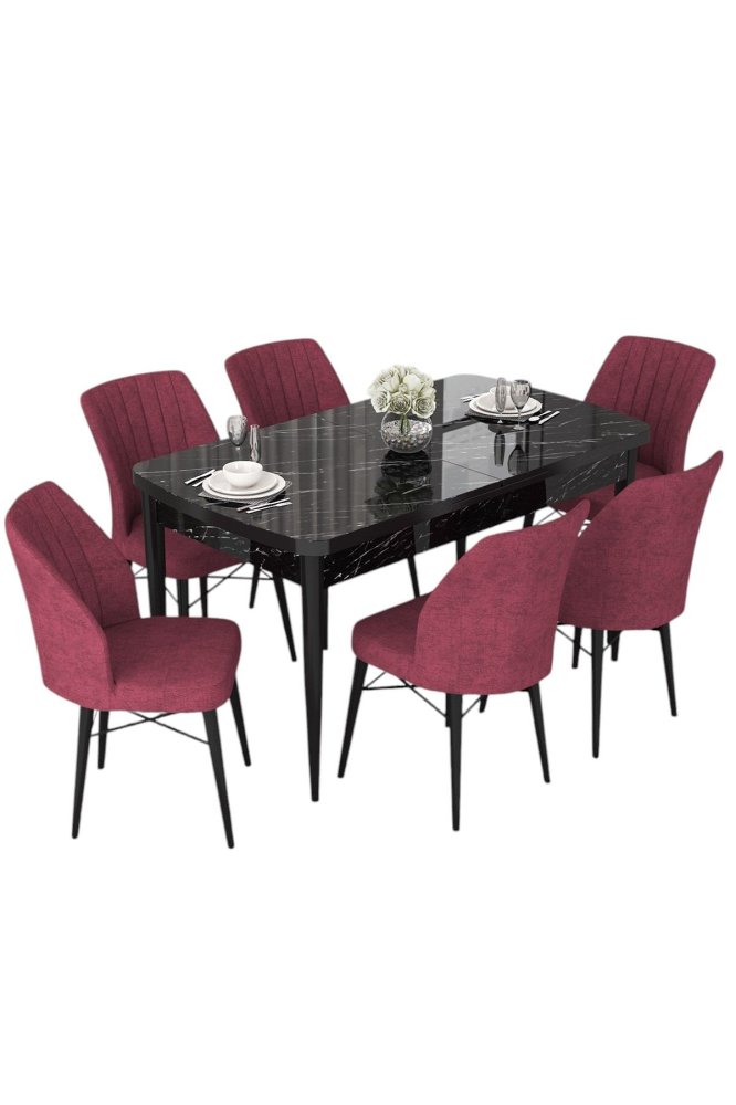HANAH HOME Set Trpezarijski sto i 6 stolica Nef Black Marble Burgundy
