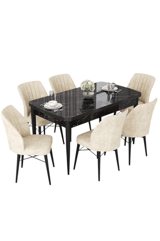 | Specifikacija |  Trpezarijski set: Sto i 6 stolica Materijal ploče stola: 100% Medijapan Materijal nogara stola: Drvo Materijal okvira stolica: Metal Materijal nogara stolica: Drvo Materijal tkanine: Jerry tkanina Punjenje sedišta: 28 DNS pena Punjenje naslona: 22 DNS pena Dimenzije stola: Širina: 114 cm Visina: 78 cm Dubina: 70 cm Dimenzije razvučenog stola: Širina: 144 cm Visina: 78 cm Dubina: 70 cm Dimenzije stolice: Širina: 45 cm Visina: 90 cm Dubina: 42 cm Visina sedišta: 46 cm Broj stolica u setu: 6  |