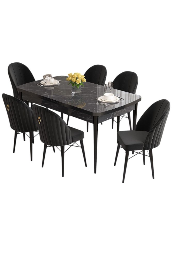 HANAH HOME Set Trpezarijski sto i 6 stolica Roz Black Marble Black