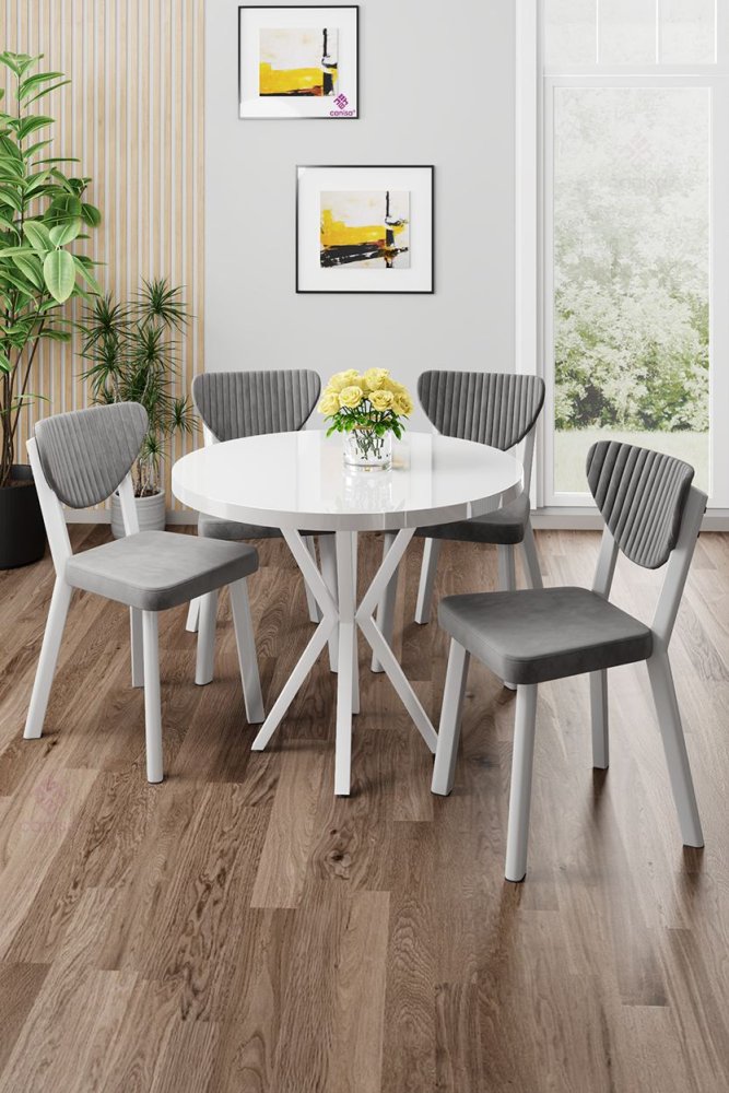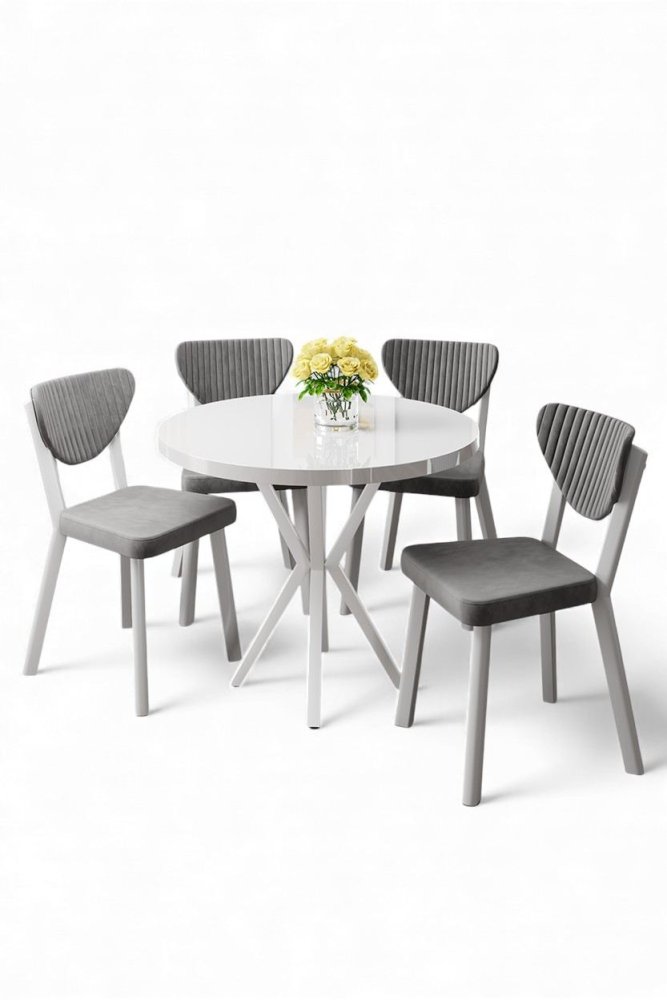 | Specifikacija | Set trpezarijskog stola i stolica (5 delova) Agnes White Grey 100% Iverica sa melaminskim premazom Metalne nogare Okvir stolice: Šperploča / Metal Materijal: Mekana tkanina Trpezarijski sto: Širina: 90 cm Visina: 73 cm Dubina: 90 cm (1 komad) Stolica: Širina: 45 cm Visina: 86 cm Dubina: 46 cm (4 komada) Visina sedišta: 48 cm 22 DNS pena za leđa / 28 DNS pena za sedenje Broj pakovanja: 2 100 x 100 x 11 cm / 10 kg (1 komad) 101 x 76 x 26 cm / 30 kg (1 komad) |