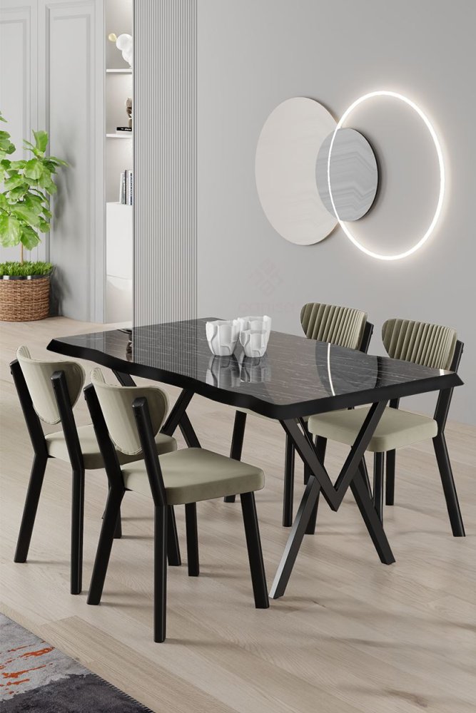 | Specifikacija | Set trpezarijskog stola i stolica (5 delova) Akort Black Marble Cream 100% MDF Metalne nogare Okvir stolice: Šperploča / METAL Materijal: Mekana tkanina Trpezarijski sto: Širina: 130 cm Visina: 73 cm Dubina: 130 cm (1 komad) Stolica: Širina: 45 cm Visina: 86 cm Dubina: 46 cm (4 komada) Visina sedišta: 48 cm (4 komada) 22 DNS pena za leđa / 28 DNS pena za sedenje Broj pakovanja: 2 137 x 88 x 11 cm / 21 kg (1 komad) 101 x 76 x 26 cm / 30 kg (1 komad) |