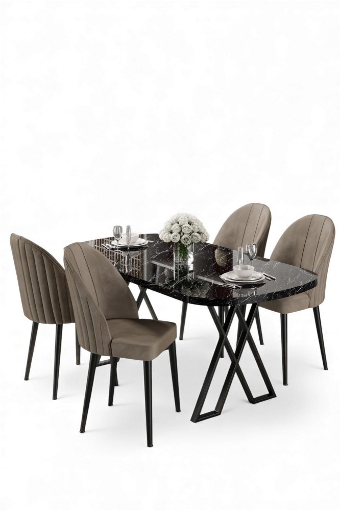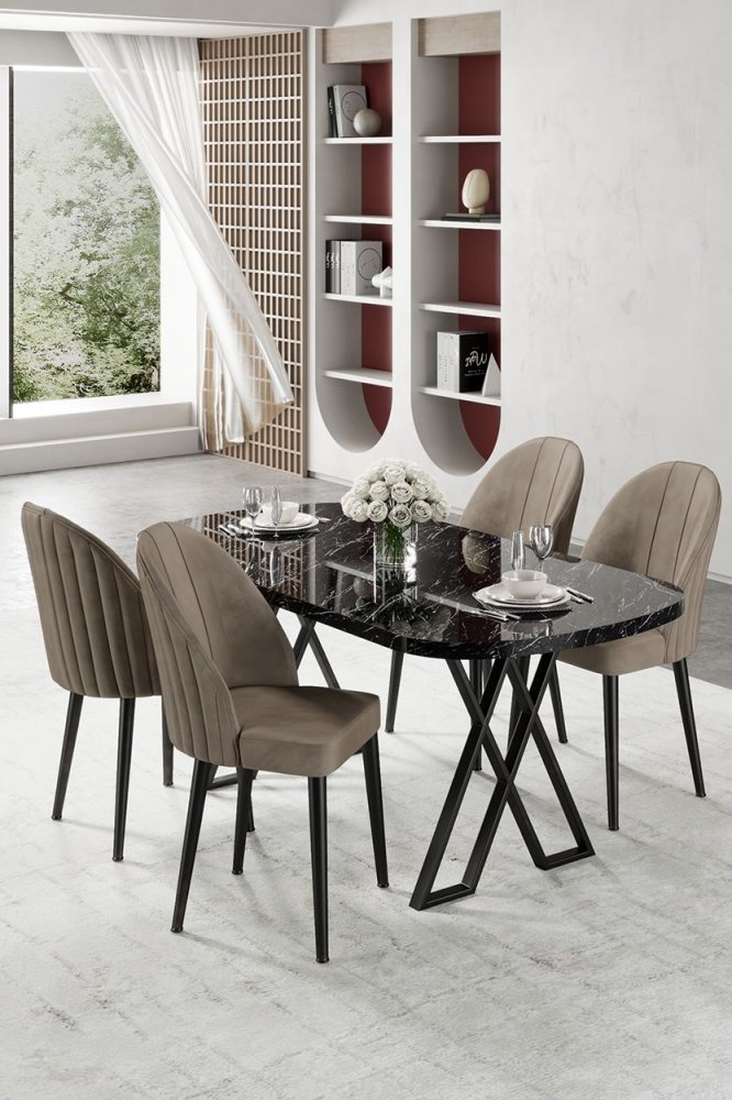 | Specifikacija | Set trpezarijskog stola i stolica (5 delova) Kaye Black Marble Cappuccino 100% MDF Metalne nogare Ram stolice: METAL Materijal: Mekana tkanina Trpezarijski sto: Širina: 168 cm Visina: 76 cm Dubina: 90 cm (1 komad) Stolica: Širina: 44 cm Visina: 90 cm Dubina: 42 cm (4 komada) Visina sedišta: 47 cm Visina nogara: 43 cm 22 DNS pena za leđa / 28 DNS pena za sedenje Broj pakovanja: 4 173 x 9 x 95 cm / 25 kg (1 komad) 11 x 75 x 62 cm / 6 kg (1 komad) 85 x 59 x 50 cm / 18 kg (1 komad) 62 x 48 x 56 cm / 10 kg (1 komad) |