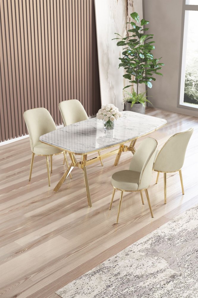 | Specifikacija | Set trpezarijskog stola i stolica (5 delova) Lena White Marble Gold Cream 100% LAKOVANI PANEL Metalne nogare Okvir stolice: METAL Materijal: Mekana tkanina Trpezarijski sto: Širina: 160 cm Visina: 75 cm Dubina: 90 cm (1 komad) Stolica: Širina: 45 cm Visina: 91 cm Dubina: 42 cm (4 komada) Visina sedišta: 47 cm Visina nogara: 43 cm 22 DNS pena za leđa / 28 DNS pena za sedenje Broj pakovanja: 4 169 x 99,5 x 10,5 cm / 25,76 kg (1 komad) 37,5 x 80 x 19 cm / 7,58 kg (1 komad) 77 x 58 x 49 cm / 16 kg (1 komad) 63 x 49 x 45 cm / 8 kg (1 komad) |