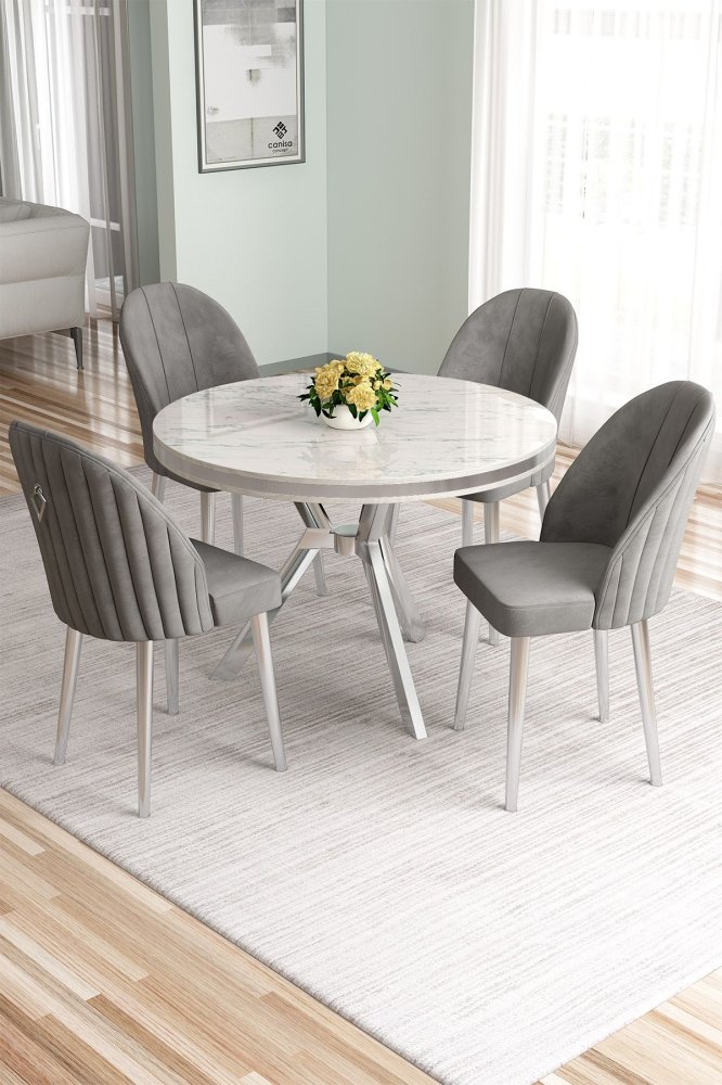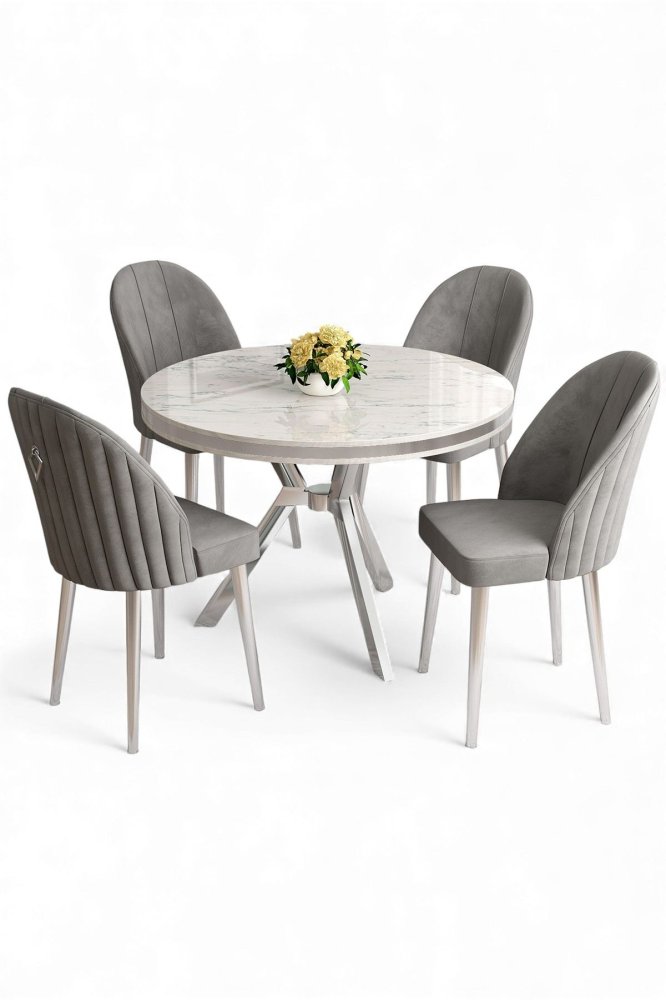 | Specifikacija | Set trpezarijskog stola i stolica (5 delova) Mos White Marble Chrome Grey 100% LAKOVANI PANEL Metalne nogare Okvir stolice: METAL Materijal: Mekana tkanina Trpezarijski sto: Širina: 90 cm Visina: 74 cm Dubina: 90 cm (1 komad) Stolica: Širina: 45 cm Visina: 91 cm Dubina: 42 cm (4 komada) Visina sedišta: 47 cm Visina nogara: 43 cm 22 DNS pena za leđa / 28 DNS pena za sedenje Broj pakovanja: 4 10 x 97 x 97 cm / 13 kg (1 komad) 80 x 18 x 38 cm / 5 kg (1 komad) 85 x 59 x 50 cm / 18 kg (1 komad) 62 x 48 x 56 cm / 10 kg (1 komad) |