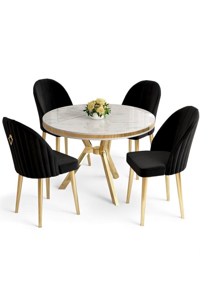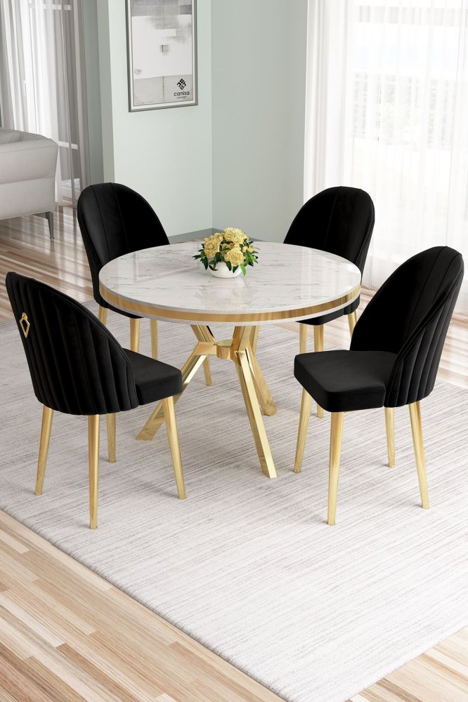 | Specifikacija | Set trpezarijskog stola i stolica (5 delova) Mos White Marble Gold Black 100% LAKOVANI PANEL Metalne nogare Okvir stolice: METAL Materijal: Mekana tkanina Trpezarijski sto: Širina: 90 cm Visina: 74 cm Dubina: 90 cm (1 komad) Stolica: Širina: 45 cm Visina: 91 cm Dubina: 42 cm (4 komada) Visina sedišta: 47 cm Visina nogara: 43 cm 22 DNS pena za leđa / 28 DNS pena za sedenje Broj pakovanja: 4 10 x 97 x 97 cm / 13 kg (1 komad) 80 x 18 x 38 cm / 5 kg (1 komad) 85 x 59 x 50 cm / 18 kg (1 komad) 62 x 48 x 56 cm / 10 kg (1 komad) |