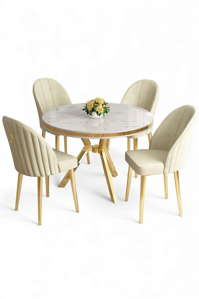 | Specifikacija | Set trpezarijskog stola i stolica (5 delova) Mos White Marble Gold Cream 100% LAKOVANI PANEL Metalne nogare Okvir stolice: METAL Materijal: Metalna tkanina Trpezarijski sto: Širina: 90 cm Visina: 74 cm Dubina: 90 cm (1 komad) Stolica: Širina: 45 cm Visina: 91 cm Dubina: 42 cm (4 komada) Visina sedišta: 47 cm Visina nogara: 43 cm 22 DNS pena za leđa / 28 DNS pena za sedenje Broj pakovanja: 4 10 x 97 x 97 cm / 13 kg (1 komad) 80 x 18 x 38 cm / 5 kg (1 komad) 85 x 59 x 50 cm / 18 kg (1 komad) 62 x 48 x 56 cm / 10 kg (1 komad) |