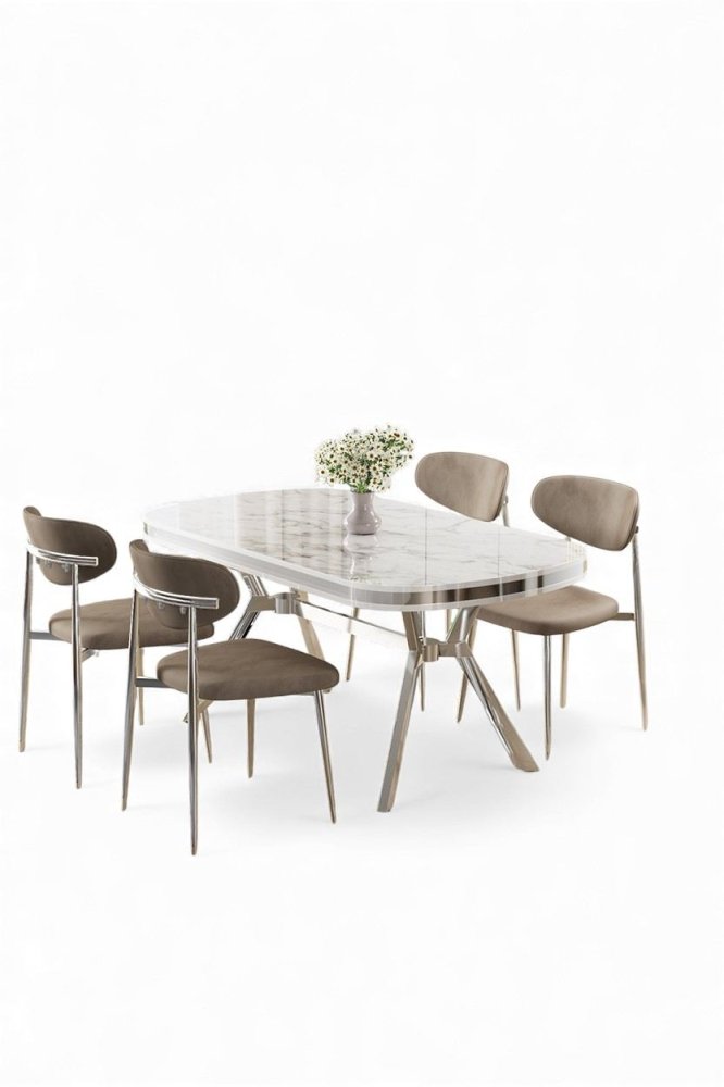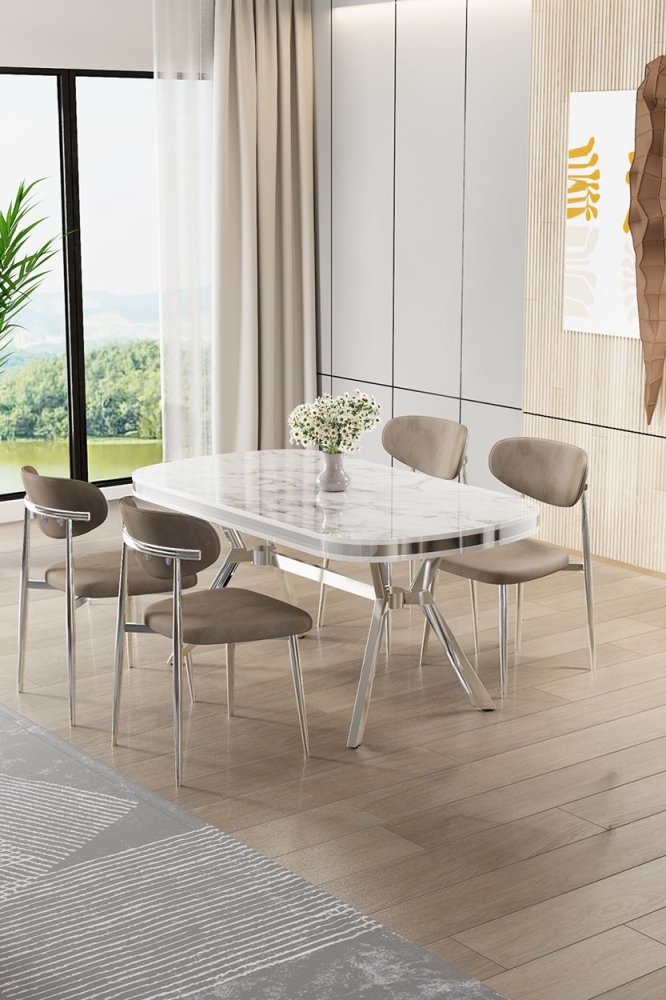 | Specifikacija | Set trpezarijskog stola i stolica (5 delova) Olya White Marble Chrome Cappuccino 100% LAKOVANI PANEL Metalne nogare Okvir stolice: ŠPERPLOČA / METAL Materijal: Mekana tkanina Trpezarijski sto: Širina: 168 cm Visina: 75 cm Dubina: 90 cm (1 komad) Stolica: Širina: 48 cm Visina: 84 cm Dubina: 49 cm (4 komada) Visina sedišta: 48 cm 22 DNS pena za leđa / 28 DNS pena za sedenje Broj pakovanja: 3 173 x 9 x 95 cm / 25 kg (1 komad) 37,5 x 80 x 19 cm / 7,58 kg (1 komad) 55 x 115 x 68 cm / 34 kg (1 komad) |