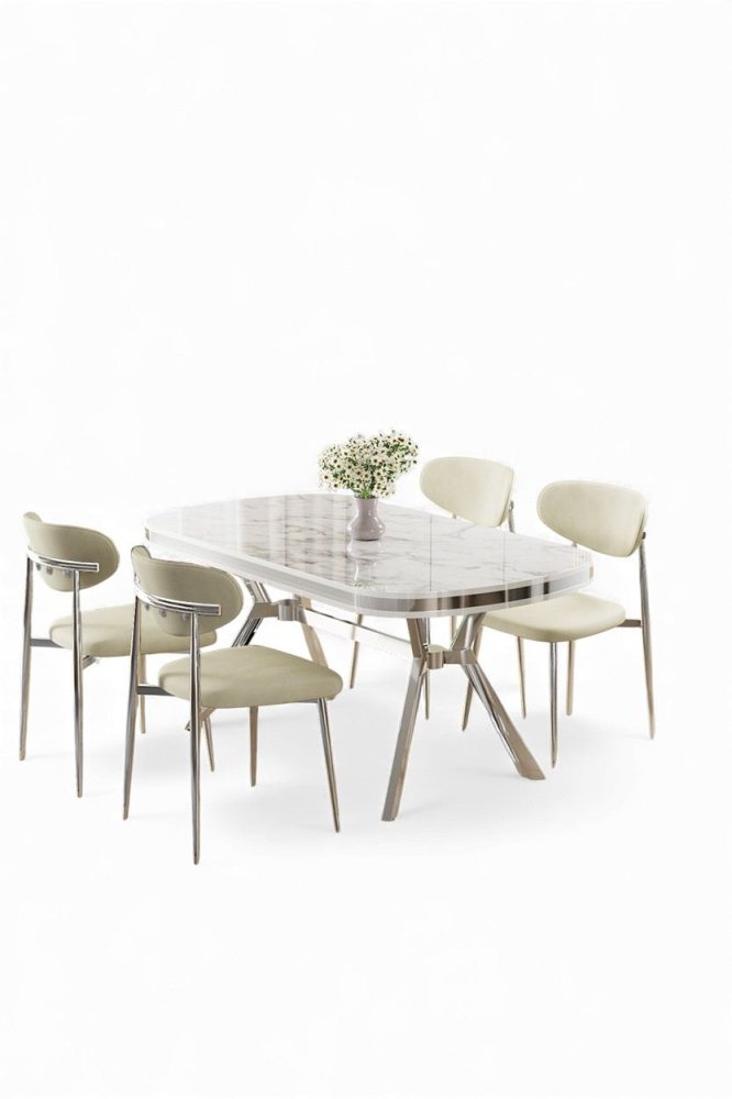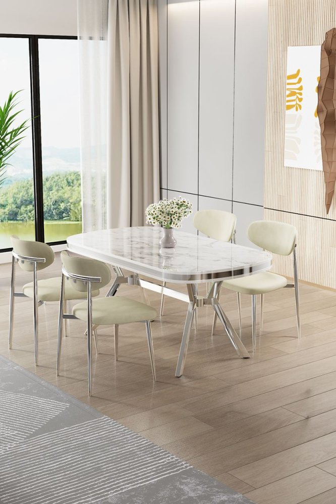 | Specifikacija | Set trpezarijskog stola i stolica (5 delova) Olya White Marble Chrome Cream 100% LAKOVANI PANEL Metalne nogare Okvir stolice: ŠPERPLOČA / METAL Materijal: Mekana tkanina Trpezarijski sto: Širina: 168 cm Visina: 75 cm Dubina: 90 cm (1 komad) Stolica: Širina: 48 cm Visina: 84 cm Dubina: 49 cm (4 komada) Visina sedišta: 48 cm 22 DNS pena za leđa / 28 DNS pena za sedenje Broj pakovanja: 3 173 x 9 x 95 cm / 25 kg (1 komad) 37,5 x 80 x 19 cm / 7,58 kg (1 komad) 55 x 115 x 68 cm / 34 kg (1 komad) |