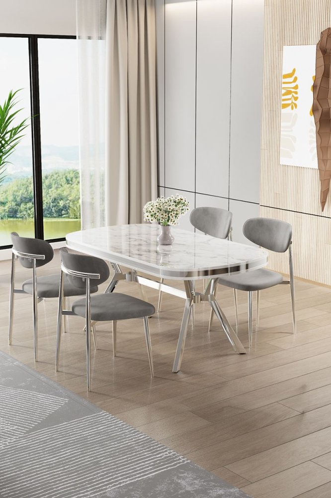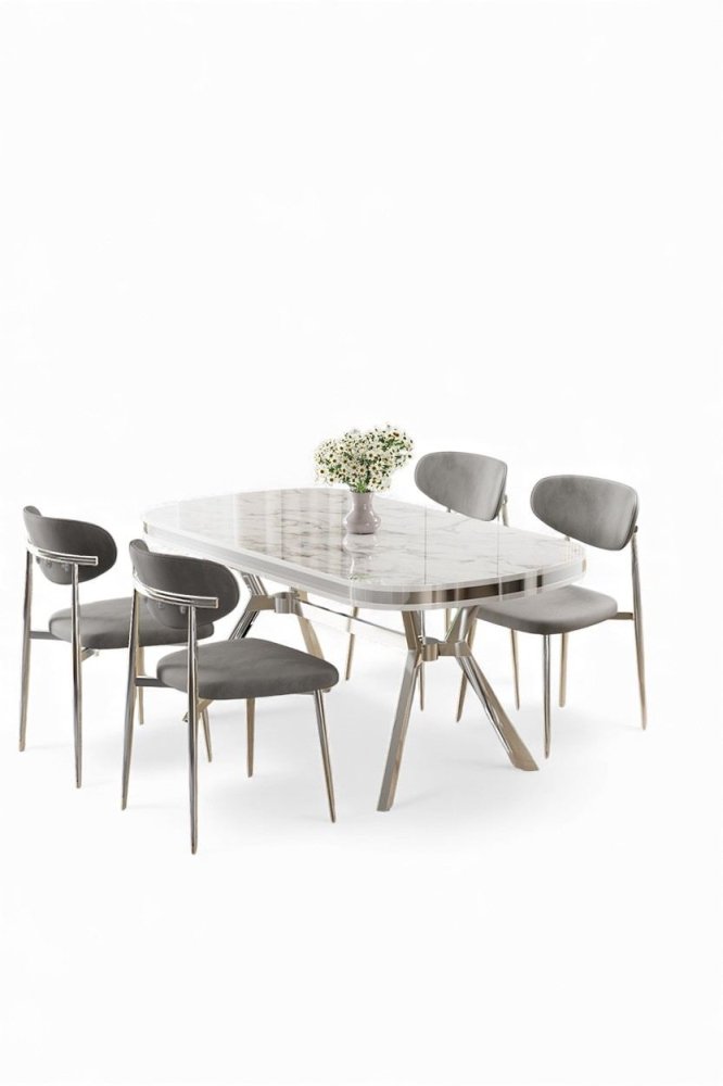 | Specifikacija | Set trpezarijskog stola i stolica (5 delova) Olya White Marble Chrome Grey 100% LAKOVANI PANEL Metalne nogare Okvir stolice: ŠPERPLOČA / METAL Materijal: Mekana tkanina Trpezarijski sto: Širina: 168 cm Visina: 75 cm Dubina: 90 cm (1 komad) Stolica: Širina: 48 cm Visina: 84 cm Dubina: 49 cm (4 komada) Visina sedišta: 48 cm 22 DNS pena za leđa / 28 DNS pena za sedenje Broj pakovanja: 3 173 x 9 x 95 cm / 25 kg (1 komad) 37,5 x 80 x 19 cm / 7,58 kg (1 komad) 55 x 115 x 68 cm / 34 kg (1 komad) |